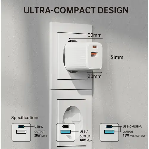 • Mini: Spare Platz an der Steckdosenleiste. Dieser Charger ist bis zu 50% kleiner, als ein herkömmliches Ladegerät.