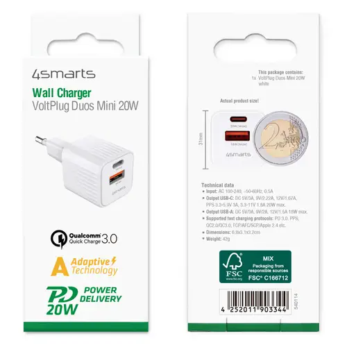• Duos USB: Mit dem VoltPlug Duos Mini 20W Power Adapter, kannst du zu Hause, im Büro und unterwegs zwei Geräte simultan laden.