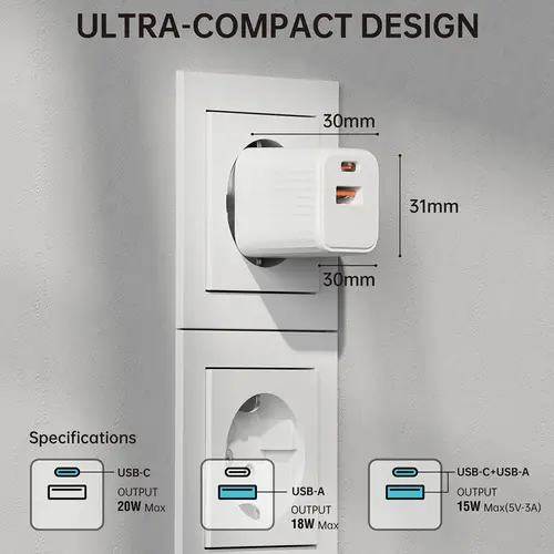 • Mini: Spare Platz an der Steckdosenleiste. Dieser Charger ist bis zu 50% kleiner, als ein herkömmliches Ladegerät.