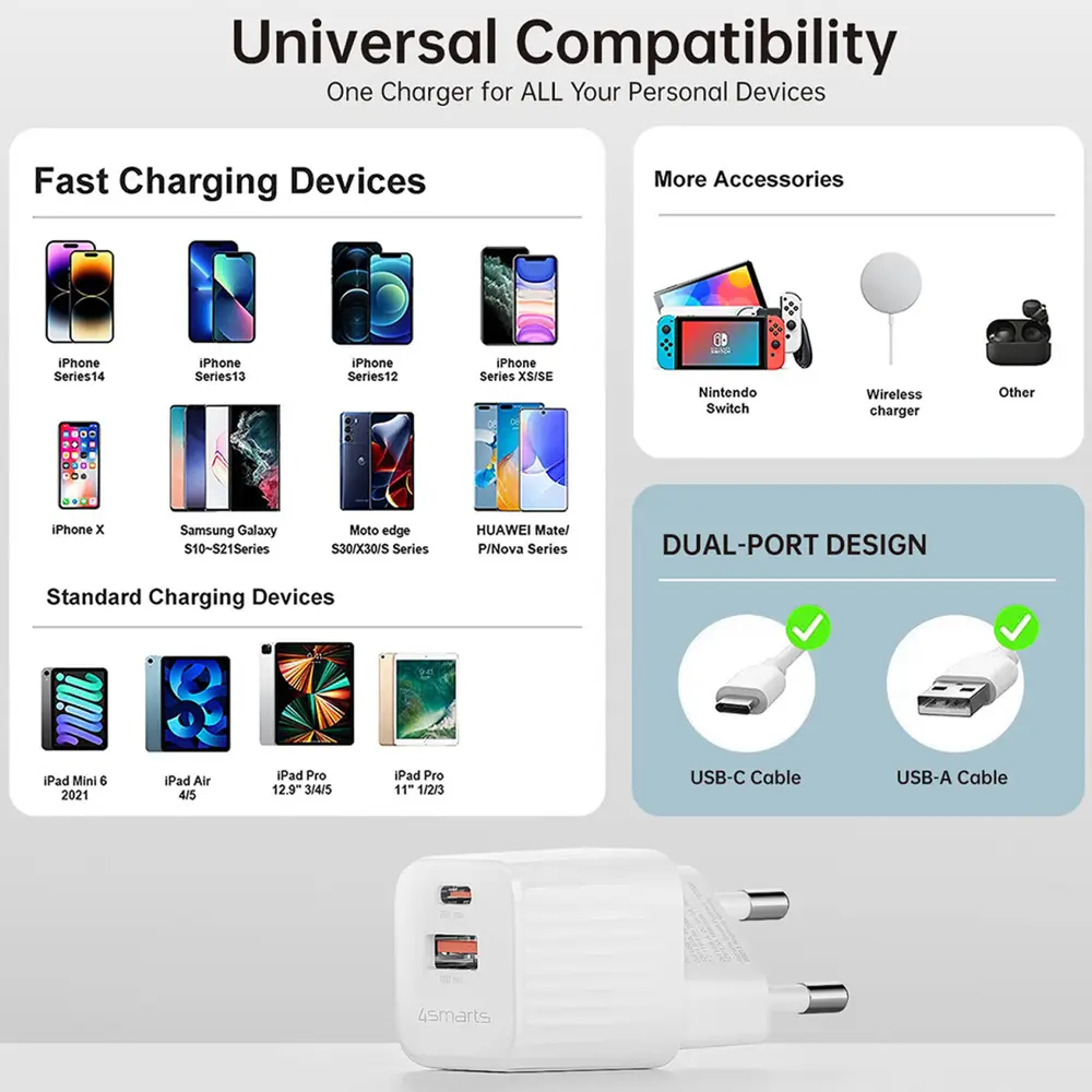 • Universal kompatibel: Der USB-C und USB-A Stromversorgungsstecker unterstützt Fast Charge, dadurch lassen sich all deine Geräte effizient und schnell aufladen.