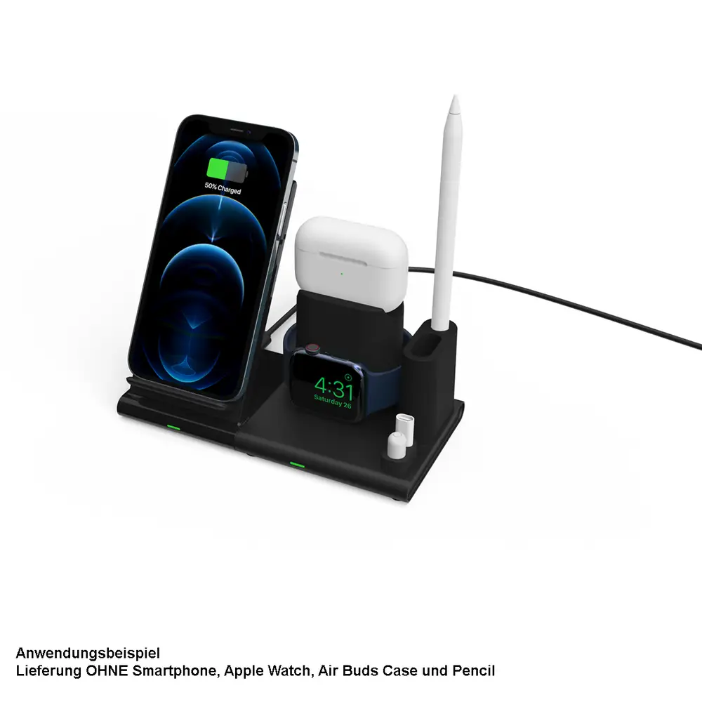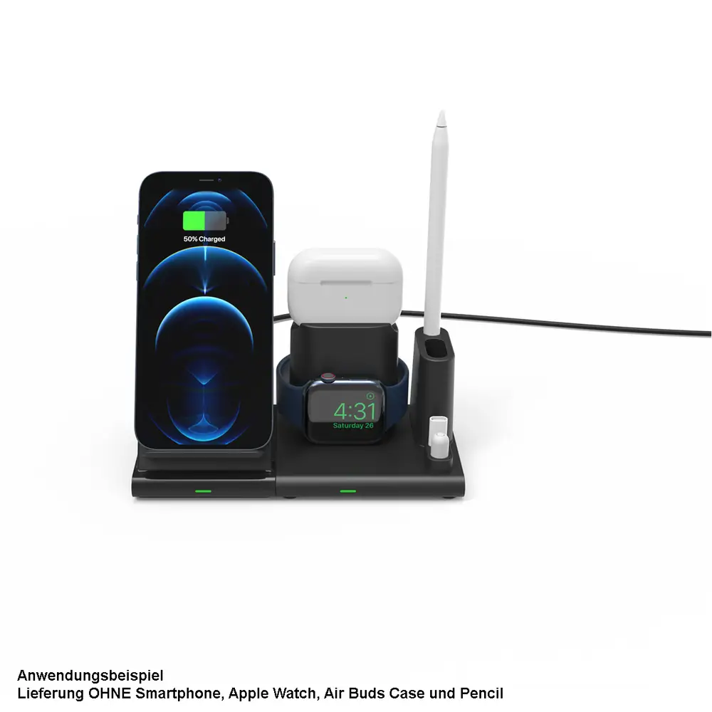 Hauptmerkmale• Modularer Aufbau für Ihren Ladebedarf. Die zwei Teile halten sich ggf. mit Magneten zusammen, um eine Einheit zu bilden. Eine Ladestation ist für Mobiltelefone und die zweite für Apple Watch / AirPods, AirPods Pro / Apple Pencil Ladeschale• Apple Pencil-Ladegerät mit Apple Pencil Cap-Halter, ideal als Kabelmanager, um Ihren Schreibtisch sauber und ordentlich zu halten und Ihre Geräte an einem Platz aufzuladen.• 100% sicheres Laden: Schutz vor Überladung, Überhitzung und Erkennung von Fremdkörpern• Das Apple Watch-Lademodul und das Lightningkabel zum Laden von AirPods sind nicht im Lieferumfang enthalten.