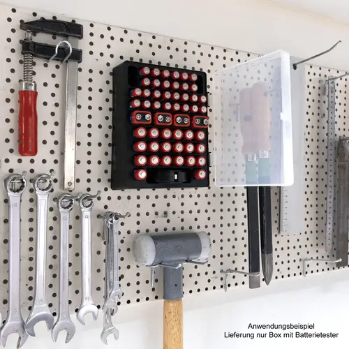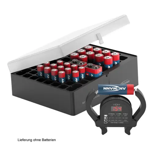 Perfekter Schutz und Transport für Ihrer Akkus & BatterienMit der praktischen Aufbewahrungsbox von ANSMANN haben Sie Ihre Akkus jederzeit geordnet und geschützt beieinander! In der Vorratsbox finden insgesamt 56 Zellen Platz: 20x Mignon, 32x Micro und 4x 9 V Block Batterien. Somit haben Sie Zuhause und unterwegs immer Ihre gängigsten Batterien oder Akkus griffbereit.Batterietester inklusiveIn der Box ist ein Batterie-Testgerät inklusive. So haben Sie jederzeit die Kapazität Ihrer Batterien / Akkus im Blick. Über das gut ablesbare LCD-Display wird die Kapazität angezeigt. Sie wissen jederzeit wie voll oder leer Ihre Zellen sind. Sie können vor wichtigen Events die Akkus laden und erkennen mit dem Tester ganz genau, wann Batterien noch genutzt oder wann sie entsorgt werden müssen.Schluss mit ungewollter Entladung! Kein Kurzschluss!In der Akkubox sind die 9V-Blöcke nicht nur optimal aufgeräumt, sie bietet gleichzeitig optimalen Schutz vor Feuchtigkeit und Staub. Vor allem schützt die Box durch ordentliche Lagerung vor ärgerlicher Entladung, was bei einem Transport oder herumliegen loser Akkus häufig vorkommt. Durch die Nutzung der Aufbewahrungsbox kann ein Kurzschluss der Zellen ausgeschlossen werden.Ihre Batterien und Akkus sind in der wiederverschließbaren Box mit robustem Deckel optimal vor Staub und Feuchtigkeit geschützt.Beste VerarbeitungWie bei allen ANSMANN Produkten, wurden auch bei der Batteriebox nur beste Materialien verwendet. Der Verschluss ist zuverlässig und sicher. Die Akkus sind während dem Transport bestens in der Box „aufgehoben“. Selbstverständlich ist die Veschlusslasche robust und dennoch supereinfach zu öffnen und wieder zu schließen.Inklusive WandhalterungDie Box verfügt über praktische Aufhängeösen auf der Rückseite. Damit ist diese ganz simpel mit den mitgelieferten Schrauben an der Wand zu befestigen.Anwendungstipp:Möchten Sie auch leere Batterien lagern – so legen Sie diese ganz einfach umgekehrt in der Aufbewahrungsbox.Die Box im Überblick• Stabile Batterie-Vorratsbox aus robustem Kunststoff, geeignet für Micro AAA, Mignon AA, und 9V E-Block Batterien/Akkus• Inklusive Batterie-Tester, die Kapazitätsanzeige erfolgt über ein sehr gut ablesbares LCD-Display• Durch die übersichtliche Box sind immer alle Batterien aufgeräumt und sicher verstaut• Nie wieder leere Batterien in der Box• Die wiederverschließbare Box bietet Platz für 20x Mignon, 32x Micro und 4x 9V E-Block Batterien/Akkus• Mithilfe der praktischen Aufhängeösen kann die Batteriebox an der Wand befestigt werden (inkl. 2 Schrauben + Dübel)• Der robuste Kunststoffdeckel bietet optimalen Schutz vor Feuchtigkeit und Staub• Schutz vor Kurzschluss und mechanischer Überlastung der Batterien bzw. Akkus