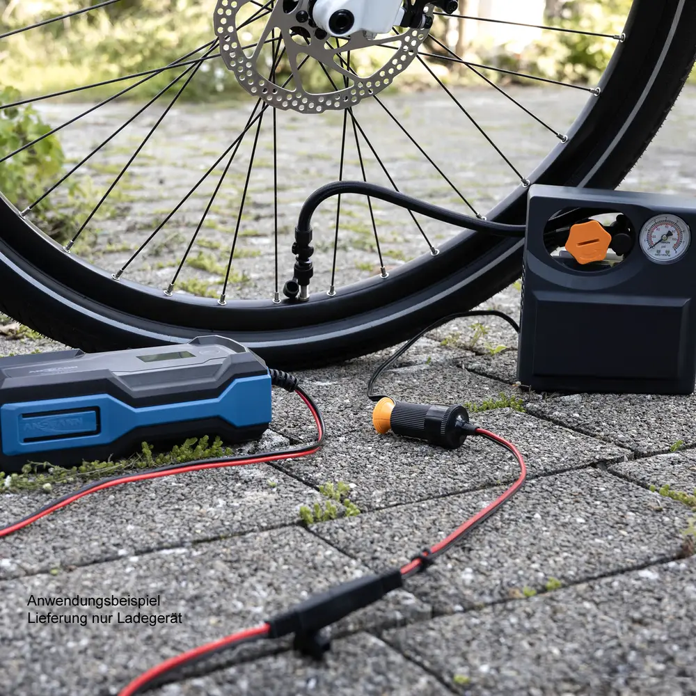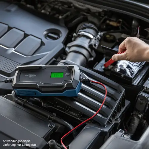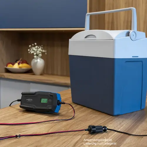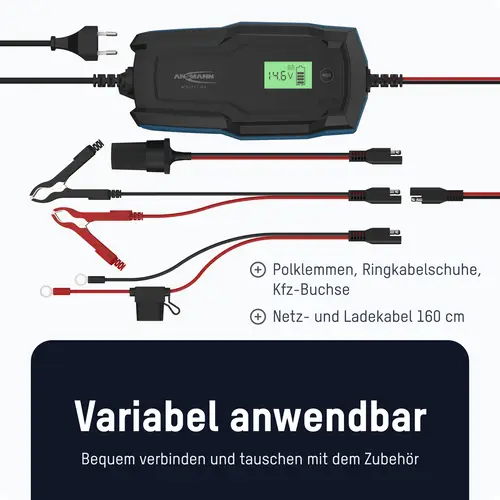 Lieferumfang: Ladegerät, Polklemmen, Ringkabelschuhe, Kfz-Buchse, Bedienungsanleitung