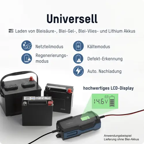Zudem ist der intelligente Lader für den Bereitschafts-/Parallelbetrieb geeignet und kann ununterbrochen am Akku angeschlossen bleiben. Es hält diesen immer voll, auch wenn der Akku gleichzeitig belastet/entladen wird.