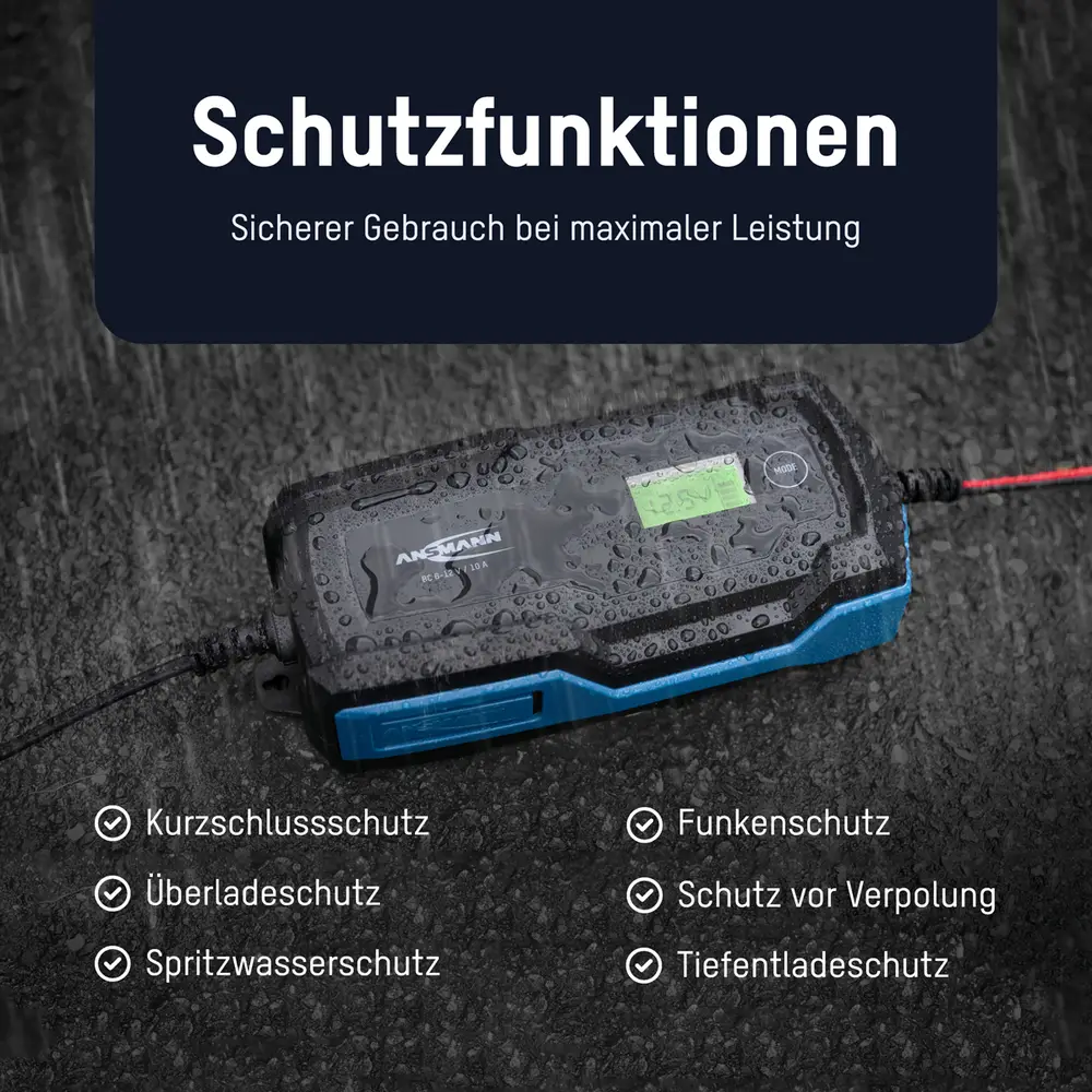 Das Ladegerät ist staub- und strahlwassergeschützt (IP65) und hat folgende elektrische Sicherheitsfeatures: Verpolschutz, Überladeschutz, Tiefentladeschutz und Kurzschlussschutz