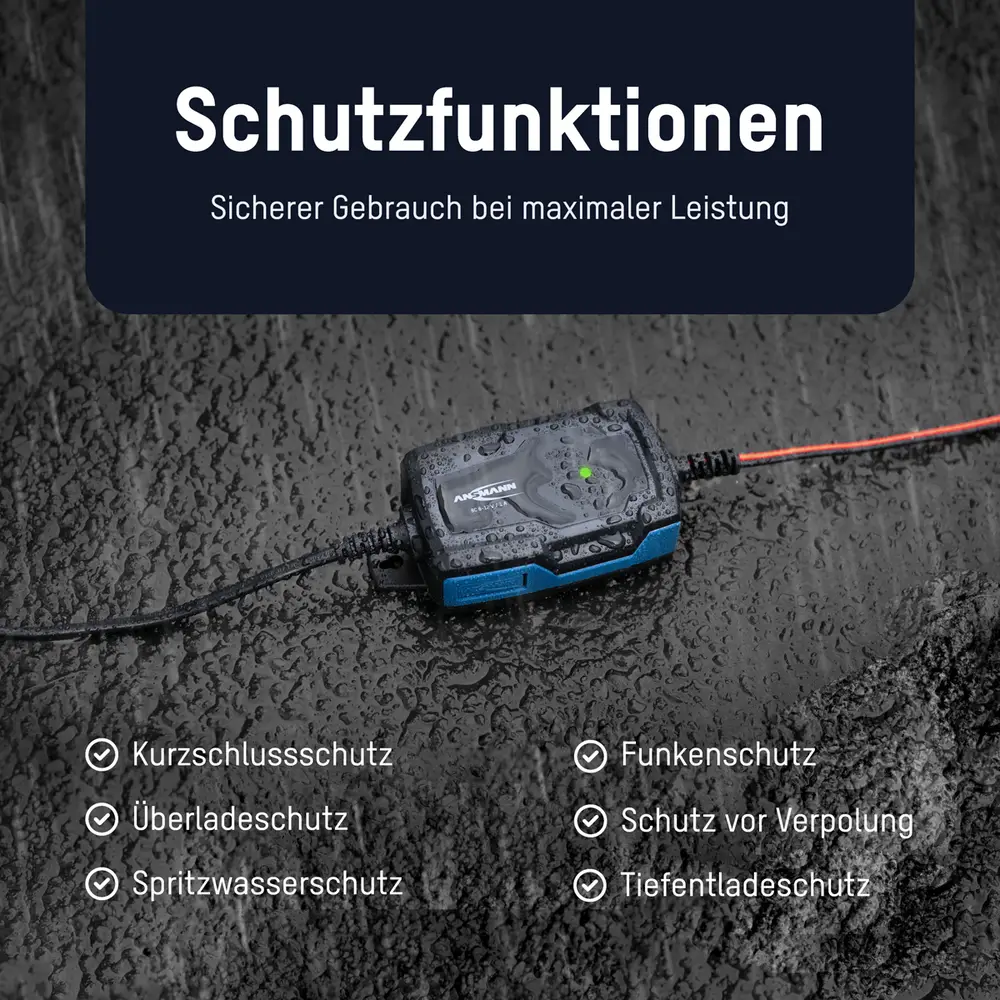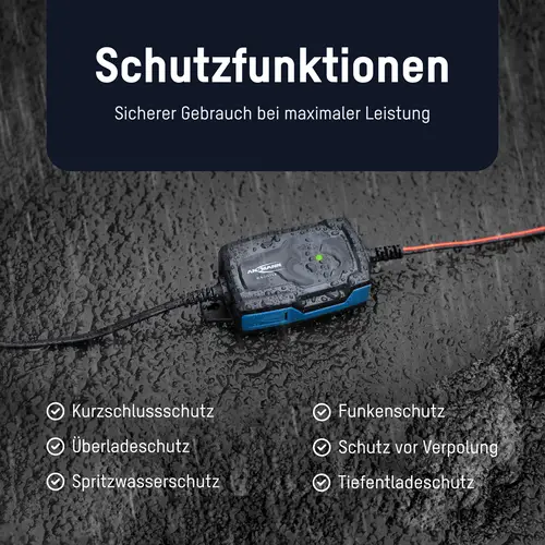 Das Ladegerät ist staub- und strahlwassergeschützt (IP65) und hat folgende elektrische Sicherheitsfeatures: Verpolschutz, Überladeschutz, Tiefentladeschutz und Kurzschlussschutz