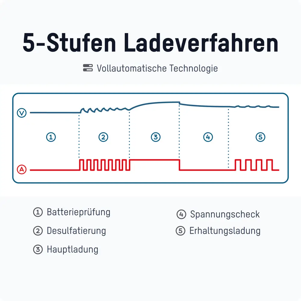 5. Erhaltungsladung: Bei Bedarf findet eine Impulserhaltungsladung statt, welche einer Entladung der Batterie vorbeugt.