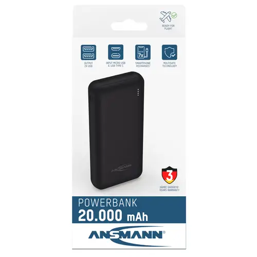 Produktspezifikationen:• Geeignet für Smartphones und Tablets, kompatibel mit Apple iPhone, iPad, Samsung Galaxy, HTC, XIAOMI, Nokia, Kindle, Blackberry und viele weitere Geräte die über USB geladen werden können• Universell aufladbar mittels gängiger USB Ladegeräte oder an der USB-Schnittstelle von PC/Laptop• Kapazität: 20000 mAh / 74 Wh• Multi-Safe-Technologie: Überladeschutz, Tiefentladeschutz, Überlastschutz und Kurzschlussschutz• Eingang: Micro-USB USB Typ-C - 5V DC / 2 A • Ausgang: 2x USB - 5V DC / 2,1 A • Zubehör: Micro-USB Ladekabel • Abmessungen (exkl. Verpackung): 148×70×28 mm