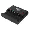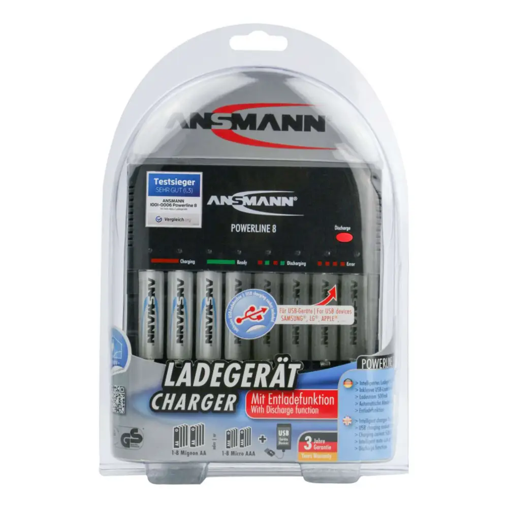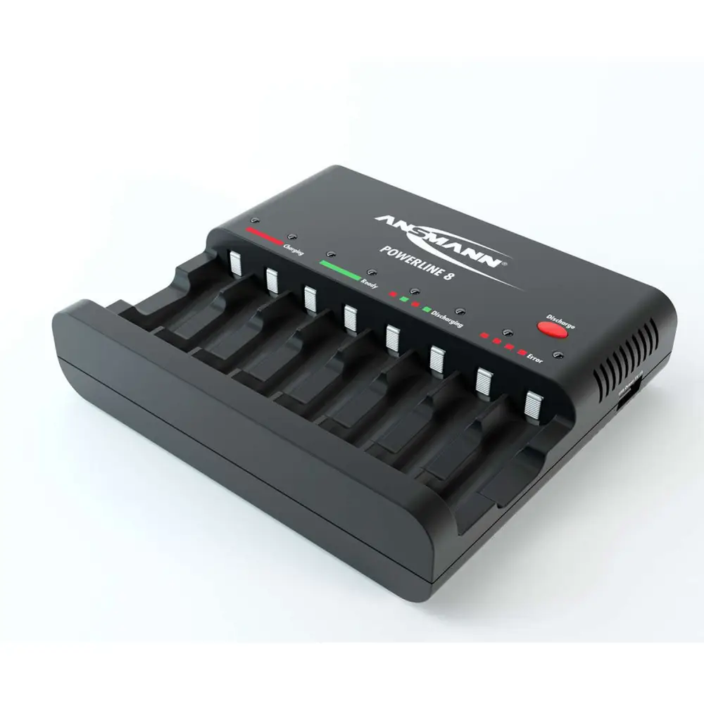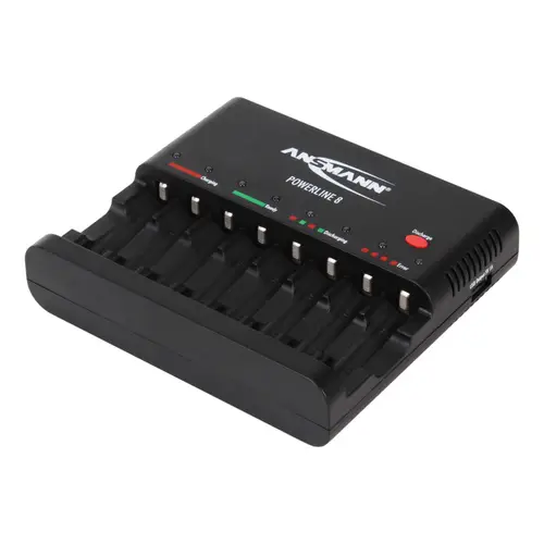 Das Powerline 8 ist die perfekte Rundum-Lösung für Fotografen, RC-Modellbauer und andere intensive Akkunutzer, die eine Vielzahl an Akkus benötigen und diese oft und zügig aufladen müssen.8 Lademöglichkeiten AAA / AA + zusätzliche USB-Ladebuchse und dabei superkompaktMit dem intelligenten Schnellladegerät können bis zu acht Akkus der Größen Mignon AA und/oder Micro AAA gleichzeitig geladen werden, auch gemischt. Dank einer zusätzlichen USB-Ladebuchse besteht sogar die Möglichkeit, verschiedenste Applikationen wie Handy, Smartphone oder MP3-Player zu laden.Akku-Defekterkennung, Verpolschutz, automatische AbschaltungDefekte oder verkehrt herum eingelegte Akkus sowie Einwegbatterien werden automatisch erkannt und nicht geladen. Dank modernster mikroprozessorgesteuerter Ladetechnik mit mehrfachem überladeschutz durch Spannungsüberwachung und Sicherheitstimer erfolgt nach der vollständigen Aufladung der Akkus die automatische Umschaltung auf Impulserhaltungsladung. Diese Funktion garantiert eine optimale Performance und eine lange Akkulebensdauer. Mehrfarbige LEDs zeigen für jeden Schacht separat den Ladestatus an.Das Netzteil des Powerline 8 wurde mit einem Weitbereichseingang von 100 bis 240 Volt für den weltweiten Einsatz konzipiert.EntladetasteFür vorgeschädigte bzw. nach langer Lagerung etwas "müde gewordene" Rundzellen steht eine Entladefunktion zur Verfügung. Durch wiederholtes Entladen und Laden lassen sich diese Akkus auffrischen und die Kapazität wieder steigern.EinzelüberwachungJeder Akkuschacht wird separat überwacht, sodass die Akkus individuell und unabhängig voneinander mit einem Ladestrom von 500mA bis zur maximalen Kapazität geladen werden können.