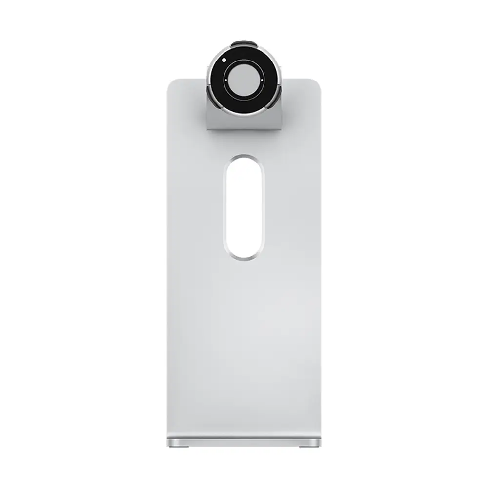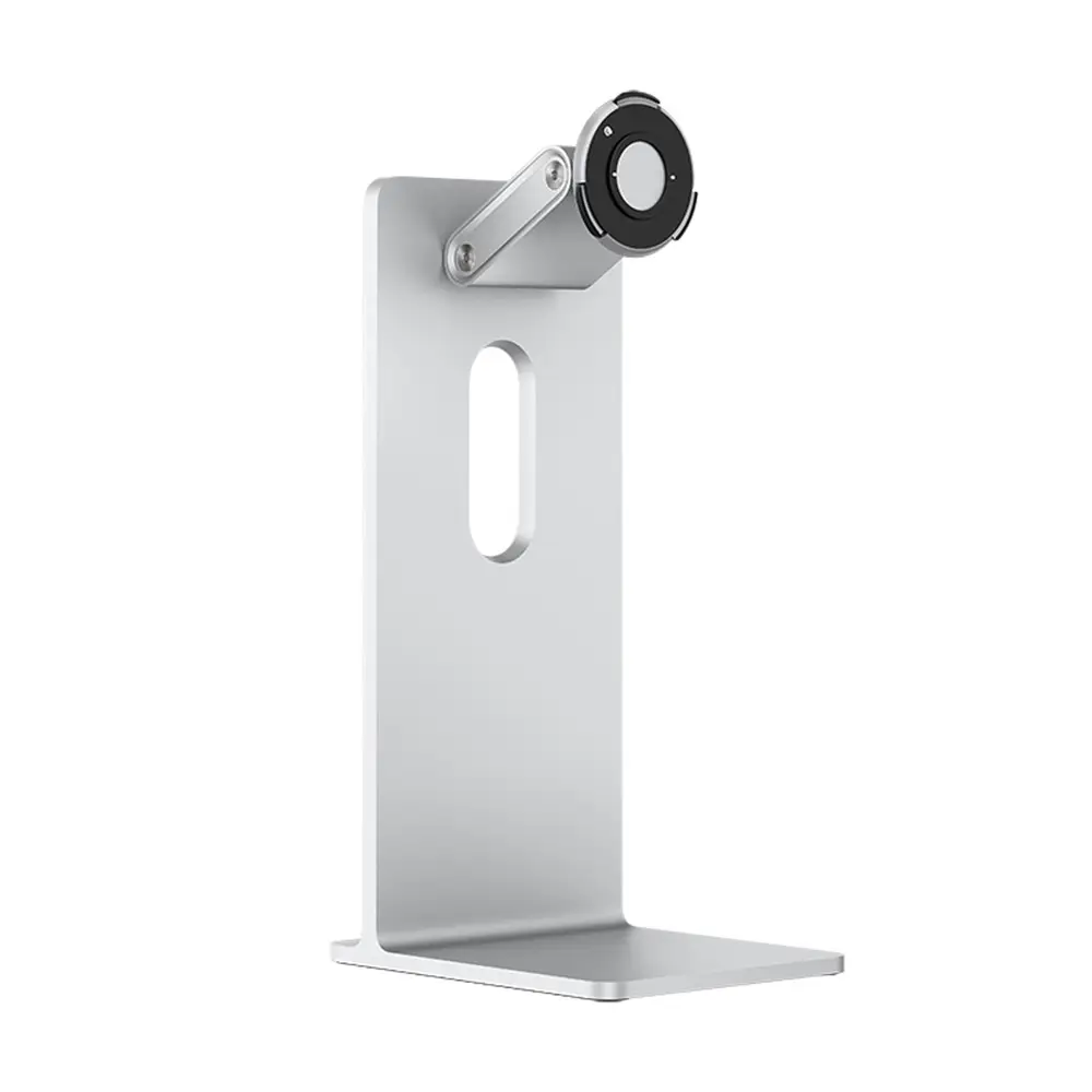 Der puckförmige magnetische Anschluss des Ständers passt an die Rückseite des Displays und verbindet Pro Stand und Display sicher miteinander. Um das Display wieder abzunehmen, entriegelst du einfach den Schieber, bringst das Display in eine starke Rückneigung, um die Magnete zu lösen, und hebst es dann vom Pro Stand.