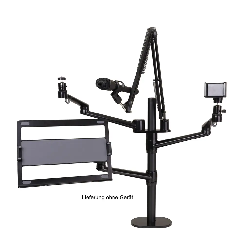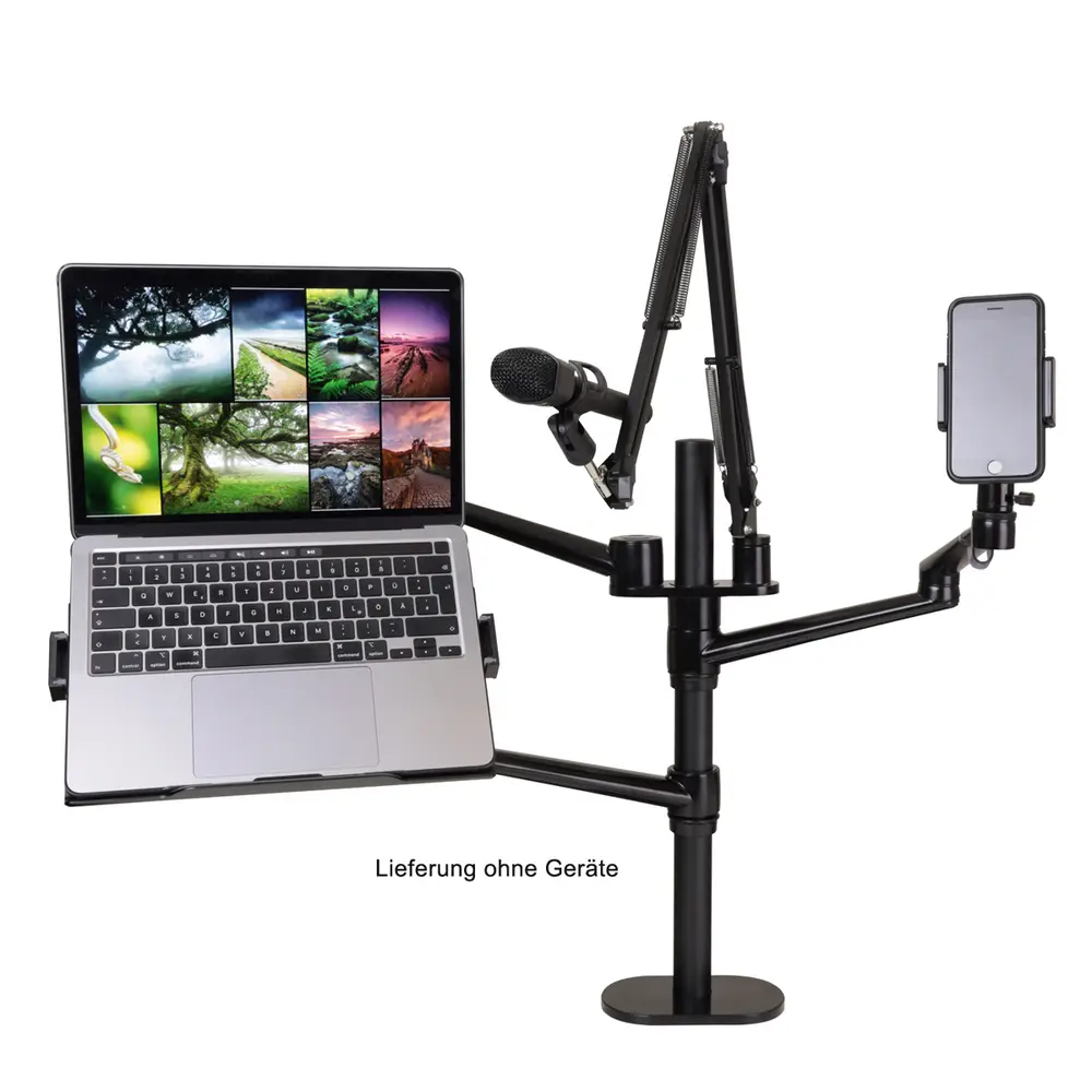 Für z.B. Online-Bildung, Firmenmeeting, professionelle Aufzeichnung, Musik-, Unterhaltungs-, oder Spielstreaming. Dank der freien Anbringung und Positionierung verschiedener Geräte an den beweglichen Armen, wie z. B. 12-17 Zoll Laptop, 17-32 Zoll Monitor, 3,5-6,7 Zoll Mobiltelefon, 7-13 Zoll Tablet, SLR- oder DSLR-Kamera erhält man immer ein individuell angepasstes Setup für einen optimalen Workflow. An den Armen kann weiteres Zubehör wie eine individuelle Beleuchtung oder ein Mikrofon befestigt werden. Das DS-4 Desk Livestream Blogger Studio kommt mit einer robusten Klemmung für die Montage an Tischplatten von ca. 20 bis 70mm Dicke.
