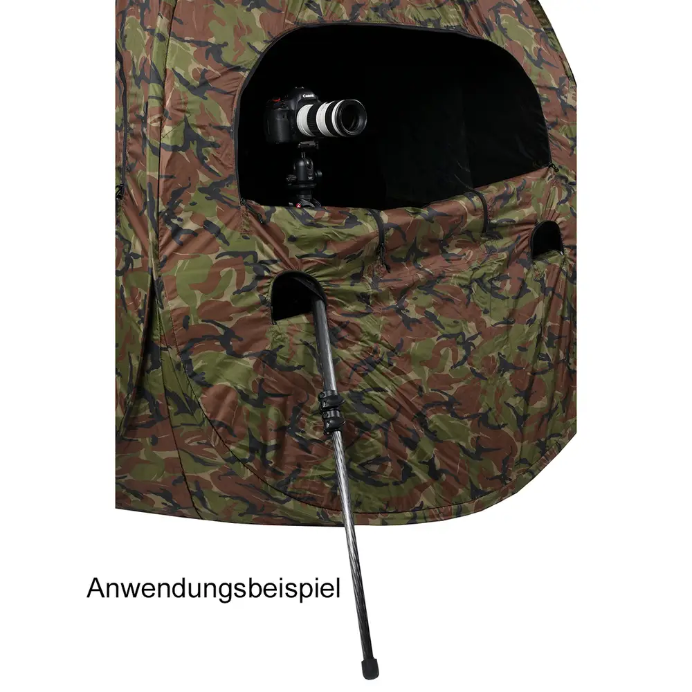 Dank PopUp-Prinzip ist es in wenigen Minuten aufgebaut, fixiert und einsatzbereit. Print in Tarnfarbe mit dunkler Innenbeschichtung gegen Durchschimmern und gegen austretende Gerüche, damit das Wild die Witterung nicht aufnimmt.Große Tür mit Reißverschluss an der Front. An allen 4 Seiten je ein Beobachtungsfenster mit Reißverschluss und zusätzlichem Fliegengitter, befestigt mit Klettband. An den Seiten und der Rückseite besitzt das B.I.G. TENT-L breite Panoramafenster. Zudem findet man an der Rückseite 2 kleine Reißverschlussöffnungen zum Ausstellen des Stativbeins, sodass im Zelt weniger Platz durch ein Stativ verloren geht.