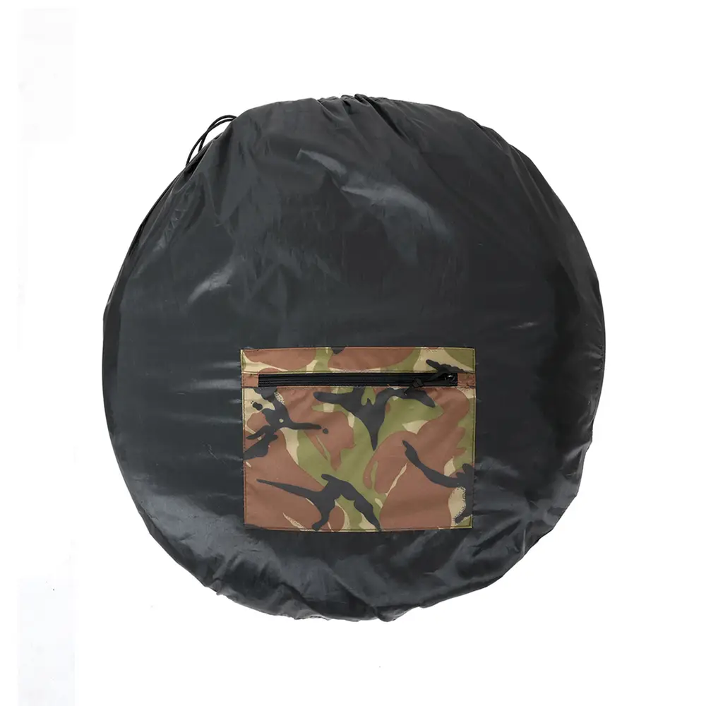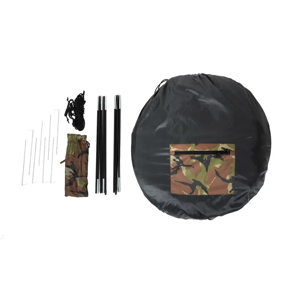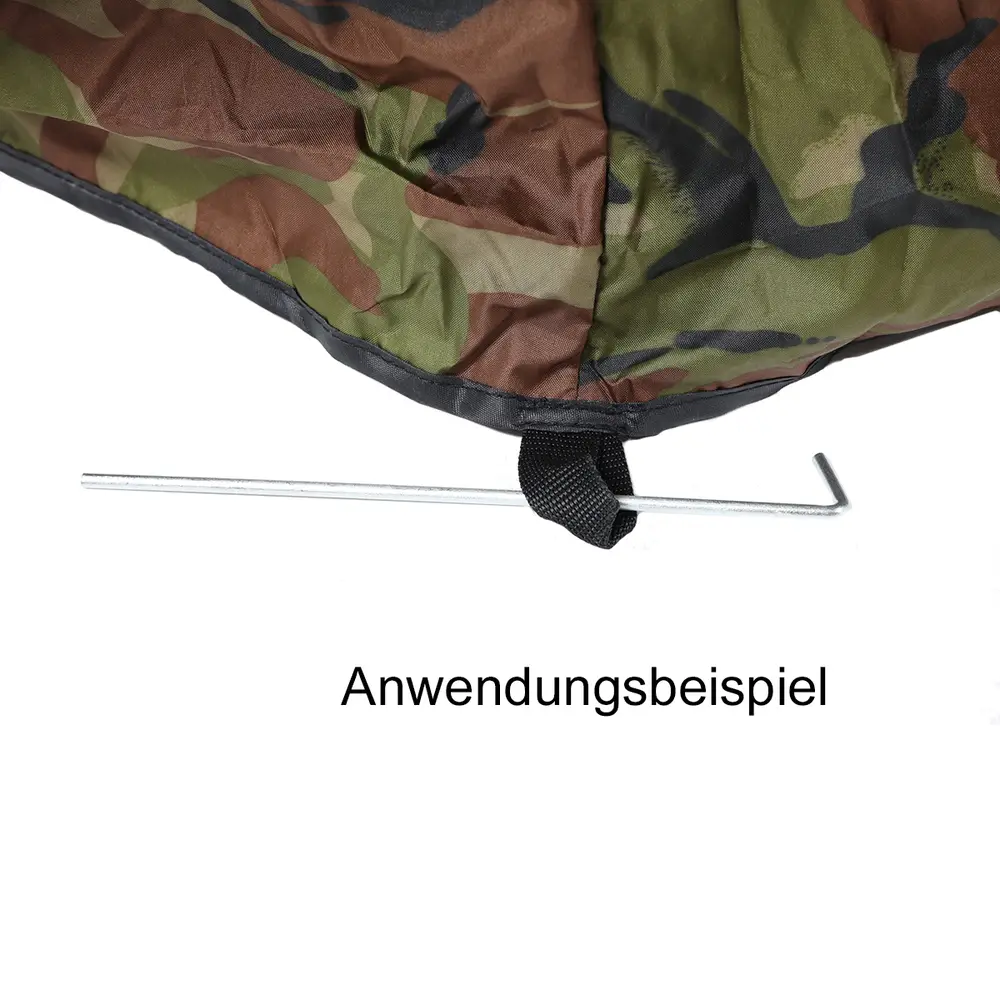 Die volle Höhe des Tarnzelts ergibt sich durch Einsetzen von 2 mehrteiligen Gestängen im Innenbereich. Hierfür findet man Schlaufen an allen 4 Ecken, in denen das Gestänge eingespannt und mit Bändern fixiert wird. Zur Stabilisierung des Zelts bei windigem Wetter sind im Lieferumfang 4 Spannseile und 8 Heringe enthalten.Die praktische Transporttasche mit Zugband, in der das Zelt verstaut wird, verfügt über eine Außentasche und kann als Rucksack getragen werden.