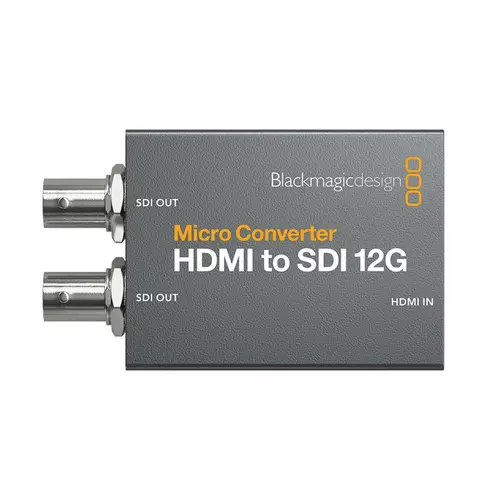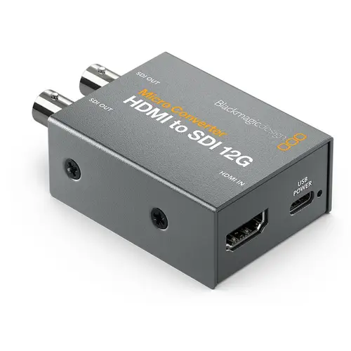 Der weltkleinste (Stand April 2023) Konverter für HDMI zu 12G-SDI in Broadcast-Qualität. Der Blackmagic Micro Converter HDMI to SDI 12G ist ein winziger Konverter in Broadcast-Qualität und ideal zum Verbinden von HDMI-Kameras und Computern mit professionellem SDI-Equipment. Geboten werden zwei 12G-SDI-Ausgänge, die in Level A oder Level B 3G-SDI-Signalformate einstellbar sind. Micro Converter sind mit HDMI-Anschlüssen in voller Größe und professionellen 12G-SDI-Anschlüssen ausgestattet und arbeiten in allen NTSC-, PAL-, 720p-,  1080p-, 1080i- und 2160p-Raten, einschließlich 4Kp24/47,95/48 DCI. Powern lässt sich der Konverter über den USB-Anschluss von Laptops oder Handyakkus.