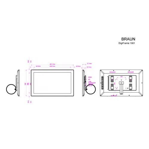 Der neue Braun DigiFrame 1901 unterstützt die Speichermedien SD+SDHC und MMC sowie USB-Speichersticks und besitzt neben dem HDMI-Eingang auch einen USB- 2.0-Anschluss sowie einen separaten Audio-Ausgang. Als Bildformate dienen JPEG, BMP und PNG. An Videoformaten werden MPEG 1/2/3, H264, RM, RMVB, MOV, MJPEG, AVI, MPG, DAT, VOB, MKV und MP4 unterstützt. Musikdateien können im MP3-Format abgespielt werden. Um den DigiFrame 1890 nicht nur im Regal oder auf der Vitrine zu platzieren, sondern auch problemlos an der Wand montieren zu können, unterstützt der Neuling den VESA-Standard (100 x 100 mm). Sein Gewicht beträgt 2,2 kg. Die Stromversorgung erfolgt über einen AC/DC-Adapter.