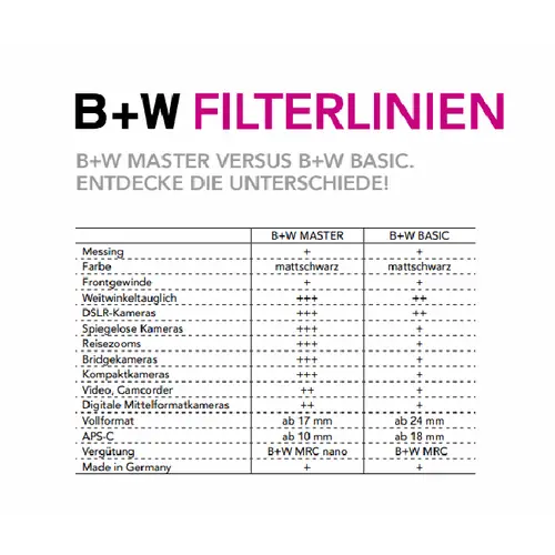 Die Fertigung aller B+W Filter erfolgt in Deutschland auf höchstem Niveau mit minimalen Toleranzen. Das Grundmaterial der Filterfassungen besteht aus Messing, ein Garant für hohe Stabilität und Langlebigkeit. Der spezielle Funktionslack erleichtert mit seinen optimierten Gleiteigenschaften das Ein- und Abschrauben des Filters. Darüber hinaus garantiert eine exakte Glasauflage einen planen und spannungsfreien Sitz des Filterglases. Die Filter eignen sich für alle Brennweiten, einschließlich (Super)Weitwinkel- bis Teleobjektiv.