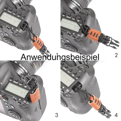 Der Clip lässt sich kinderleicht mit einer Schlaufe an den Kameraösen von Spiegelreflex-, System- und Digitalkameras von Herstellern wie Sony, Canon, Nikon und Co. befestigen. Im Lieferumfang ist der dreieckige Schlüsselring mit extra Sicherung als Verbindungsstück enthalten.