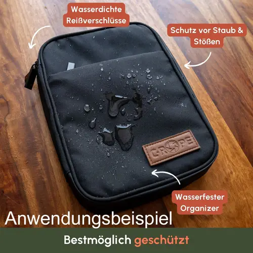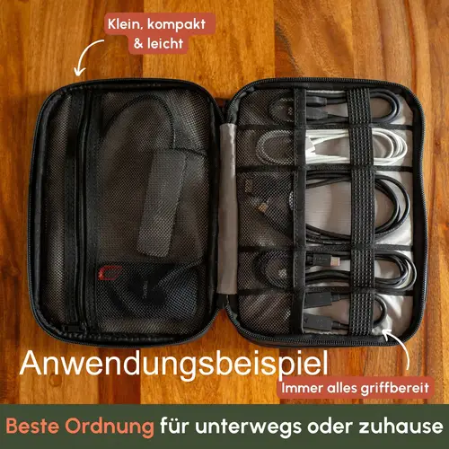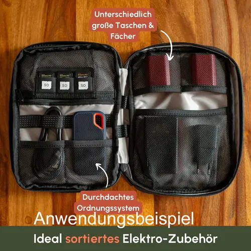 Endlich hast Du die volle Kontrolle überDeine Kabel und das heißt: Nie wieder Kabel-Chaos. In unserem Organizer kannst Du Ordnung in Kabel, SD Karten, Akkus, Powerbanks und weiteres Zubehör bringen. Und das Beste daran? Mithilfe des durchdachten Ordnungssystems hast Du alles schnell griffbereit und das ohne großes Fummeln.