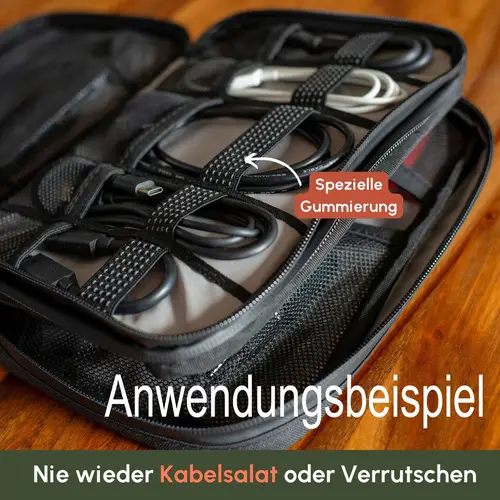 Dank der speziellen Gummierung an den Innenseiten der Gurtbänder führen Deine Kabel fortan kein Eigenleben mehr. Du wirst nie wieder den Organizer öffnen und feststellen, dass Deine Kabel verrutscht sind. Ab jetzt bleiben sie rutschfest genau dort, wo sie sein sollen.