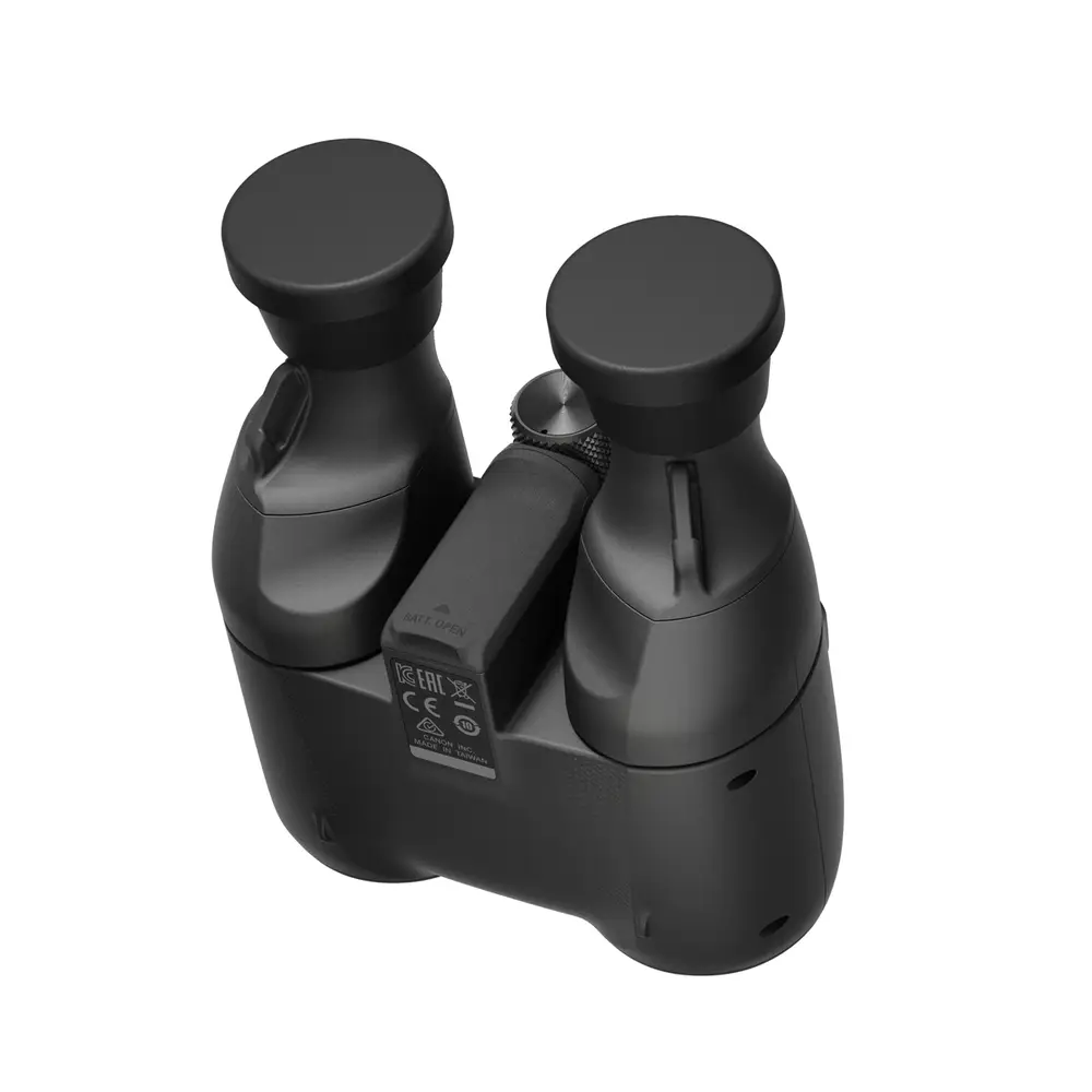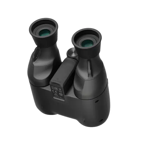 Die Taste zur Betätigung des Bildstabilisators und der Fokussierring sind mittig oben auf dem Fernglas platziert, so dass sie für Rechtshänder ebenso leicht erreichbar sind wie für Linkshänder. Die Okulare des Fernglases ermöglichen eine Dioptrienanpassung von ± 5,9 und die Gummi-Augenmuscheln lassen sich für Brillenträger anpassen.