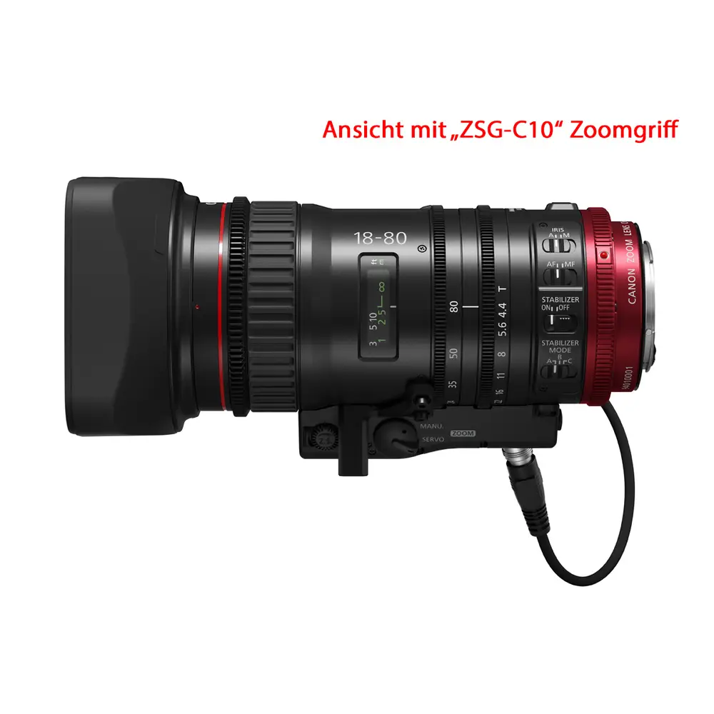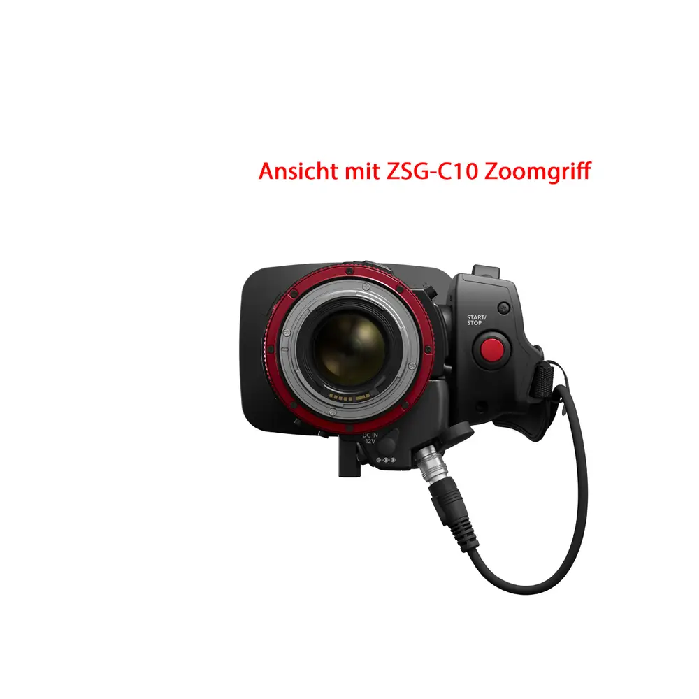 Der optionale Zoomgriff ZSG-C10 wurde exklusiv für das kompakte Canon Cine-Servo-Objektiv entwickelt und ermöglicht so eine angenehm einfache Fernsteuerung des Servo-Zooms und des One-Shot AF. Der ZSG-C10 wird über ein 20-poliges Kabel an das Objektiv angeschlossen und wird am Objektivtubus angesetzt (für den bequemen Dreh von der Schulter) – er ermöglicht aber auch die Steuerung per Hand, wenn er nicht am Objektiv befestigt ist. Der ZSG-C10 verfügt über eine leicht zu bedienende Zoomwippe, eine Start-/Stopp-Taste, eine One-Shot AF Taste und einen verstellbaren Griff für optimalen Komfort.