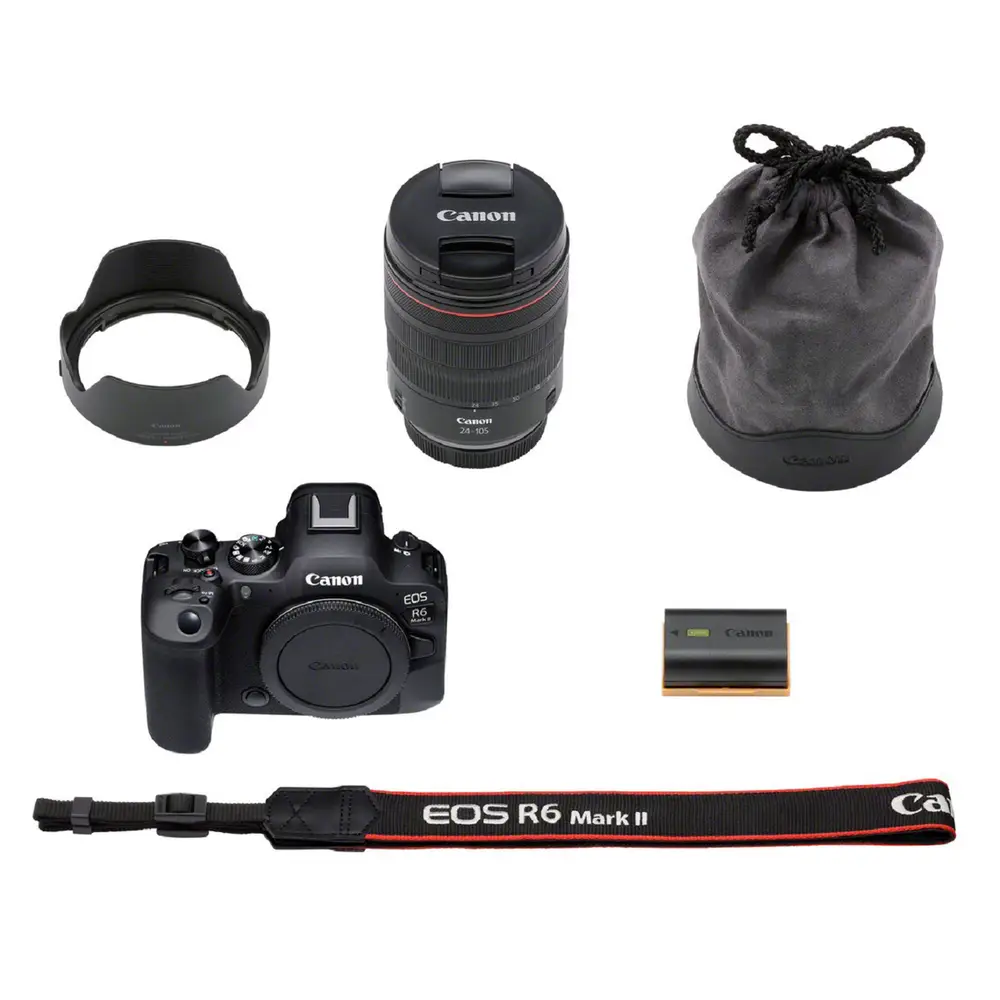 Lieferumfang:1x EOS R6 Mark II Gehäuse1x Kamera-Gehäusedeckel R-F-51x Zubehörschuh-Abdeckung ER-SC21x Tragegurt ER-EOS R6 Mark II1x Akku LP-E6NH1x Abdeckung für Akkufach1x RF 24-105mm F4 L IS USM1x Objektivdeckel E-77 II1x Streulichtblende EW-83N1x Objektivbeutel LP13191x Objektivrückdeckel RFAnleitungen (EU)