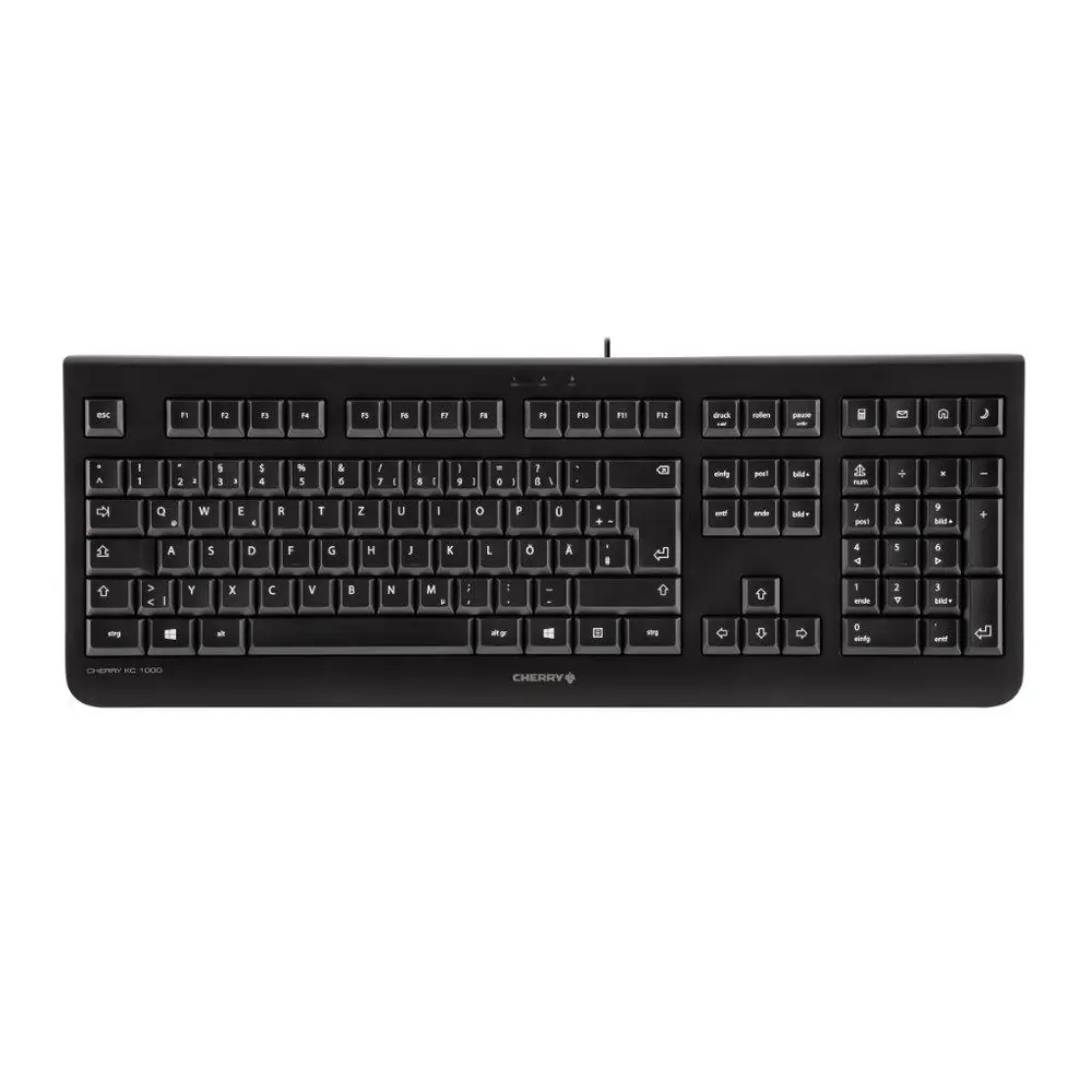 Der leise Allround-ProfiCHERRY KC 1000 ist solide CHERRY-Technologie in hervorragender Preisleistung. Modernes, flaches Design mit sanften, leisen und dauerhaft abriebfesten Tasten. Universell, zuverlässig und optimiert für professionellen Einsatz.Entscheidende Vorteile• Flache, kabelgebundene Tastatur inkl. Cursor- und Nummernblock• Flüsteranschlag-Tasten mit abriebfester Laser-Tastenbeschriftung• Bis zu 10 Millionen Tastenbetätigungen• 4 Hotkeys (Taschenrechner, E-Mail, Browser, Sleep-Modus)• Plug & Play über USB-Anschluss• 3 blau leuchtende Status-LEDs• Optimiert für professionelle Anforderungen im Office-Betrieb\n(GS-Zulassung)