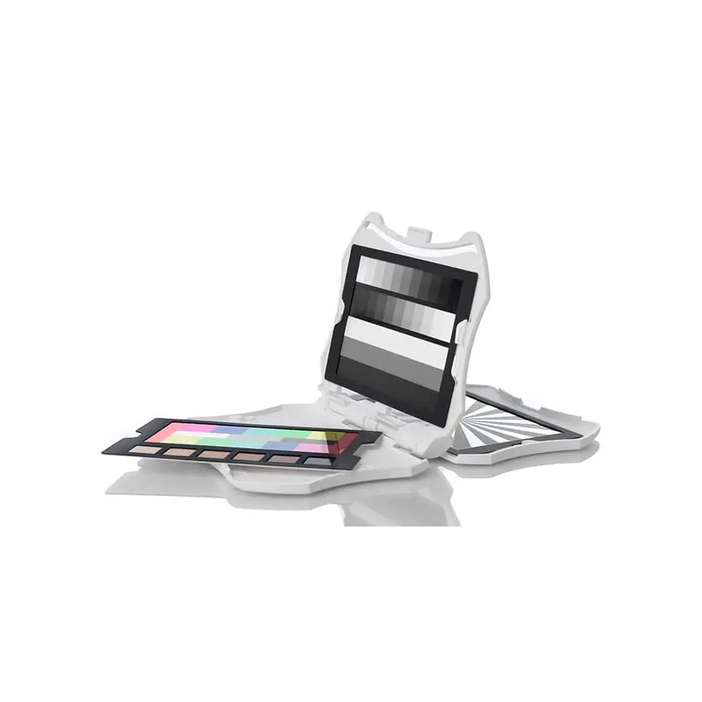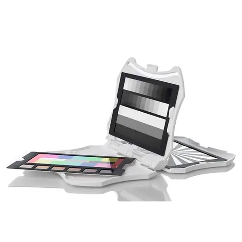 • Eine zum Patent angemeldete Videofarbzielkarte, die für eine präzisere, Videoverarbeitung mit nuancierter Farbgenauigkeit entwickelt wurde. Sie enthält 12 Farbfelder in einer einzigartigen Konfiguration mit einem schwarzen, einem grauen und einem weißen Farbfeld in der Mitte sowie 6 Hauttonfarben.