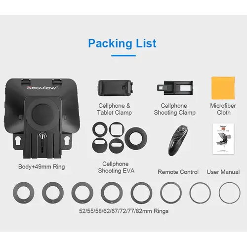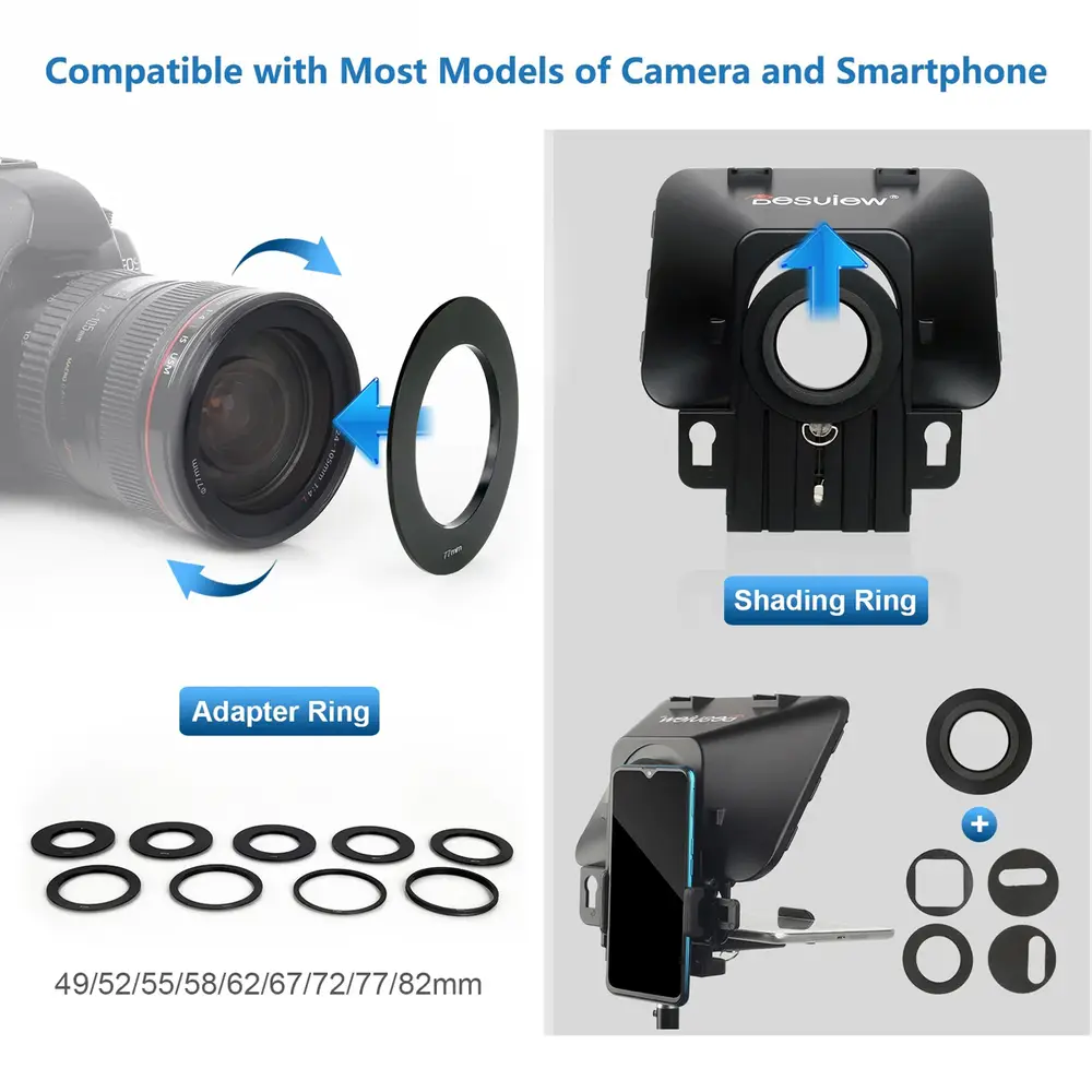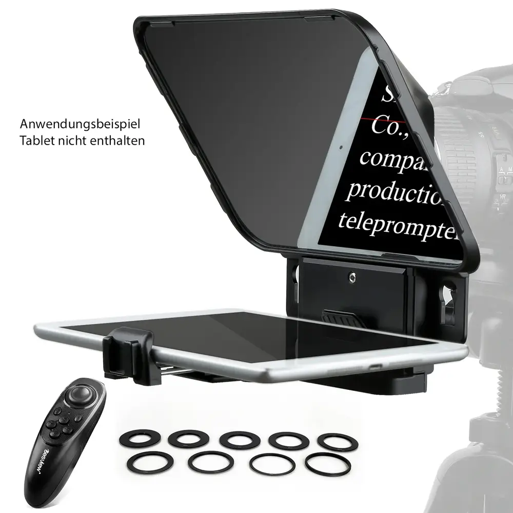 DSLR-Teleprompter-Spiegel für Smartphones und Tablets eignet sich für Live-Commerce, Online-Kursaufnahmen, Interviews und andere Szenarien, hochreflektierender Spiegel.• IOS und Android APP-Steuerung• Ausgestattet mit 49/52/55/58/62/67/72/77/82mm Objektiv-Adapter-Ringen