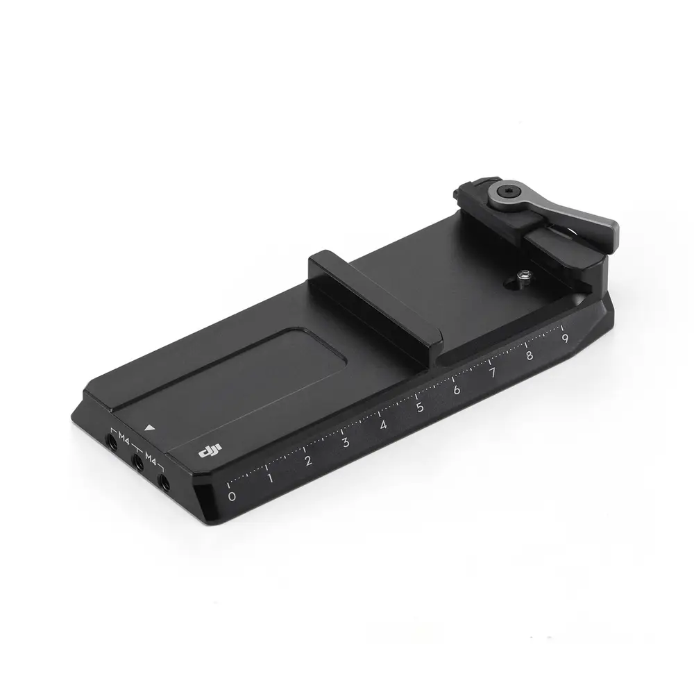 Die untere Schnellwechselplatte hat zwei Skalen auf beiden Seiten und einen gezahnten Schlitz. Der Feineinstellungsknopf an der Neigeachse des Gimbals erlaubt millimetergenaue Einstellungen beim Kamera- oder Objektivwechsel.Die untere Schnellwechselplatte verfügt über eine Skala auf beiden Seiten und ein gezahntes Schlitzdesign an der Unterseite. Sie ergänzt den Feineinstellungsknopf an der Kippachse des Gimbals, so dass Kameraleute beim Wechsel von Kameras oder Objektiven millimetergenaue Einstellungen vornehmen können. Außerdem erleichtert sie den schnellen Wechsel zwischen Stativen und Stabilisatoren für die Kamera.