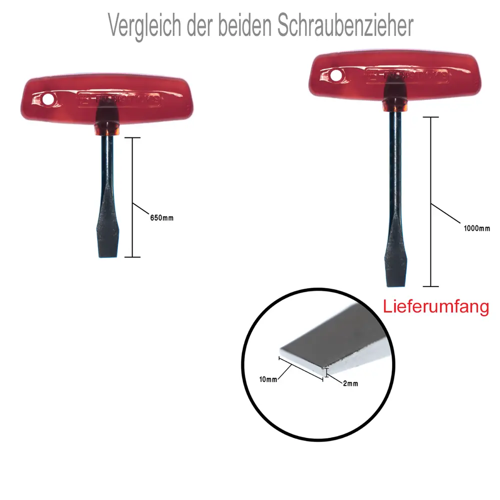 Technische Daten:Material: T-Griff: ABS (Acrylnitril-Butadien-Styrol) Kunststoff / Metallstift: Kohlenstoffstahl (Carbon)Farbe: RotGröße: 10mm SchlitzschraubendreherSchaftlänge: 100mmGesamtlänge: 136mmKopf Stil: Flach (2mm Breite)Gewicht: 101g (Stück)