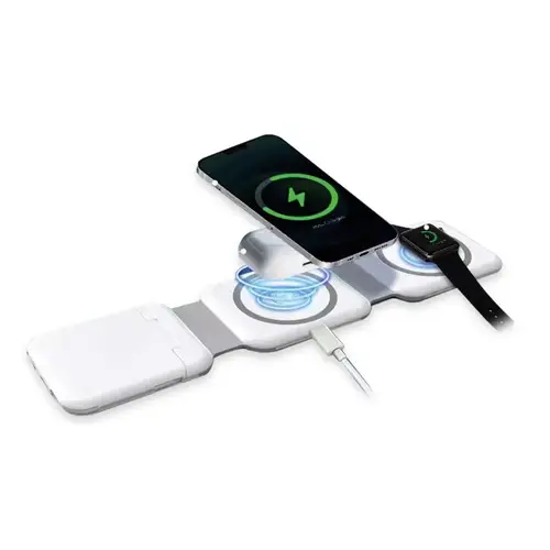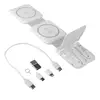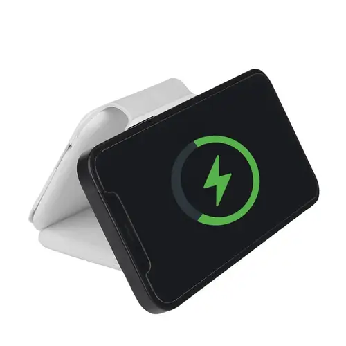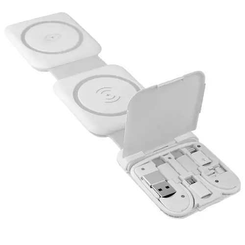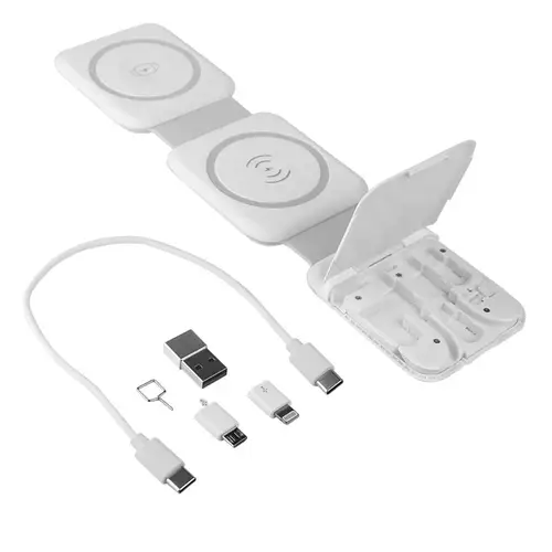 Mit dieser praktischen Ladestation können Sie Ihr Smartphone und Ihre Smartwatch gleichzeitig aufladen. Das Ladegerät ermöglicht das Aufladen von Smartphones mit bis zu 15 Watt. Für Smartwatches steht eine Leistung von 2,5 Watt zur Verfügung. Die integrierten Adapter (USB-Typ-C auf USB-A, Micro USB, 8-Pin) und das USB-Typ-C Kabel gewährleisten maximale Kompatibilität mit den meisten gängigen Geräten auf dem Markt. Durch eine Status-LED haben Sie stets im Blick, ob Ihre Geräte ordnungsgemäß geladen werden. Die Sicherheit wird durch eine intelligente Fremdkörper-Erkennung und Kurzschlussschutz gewährleistet, um Ihre Geräte zu schützen. Das Ladegerät kann beliebig zusammengefaltet oder aufgestellt werden. Die Teile des Ladegerätes werden durch die internen Magneten zusammengehalten. Die kompakte und faltbare Bauweise macht dieses Ladegerät zu einem idealen Begleiter für unterwegs.