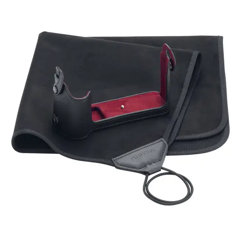 Die Tasche ist so gestaltet, dass sie beim Wechseln des Akkus nicht abgenommen werden muss. Im Lieferumfang ist ein Schutztuch enthalten, mit dem sich die Kamera bei Nichtgebrauch einschlagen und sicher in einer Fototasche verstauen lässt.