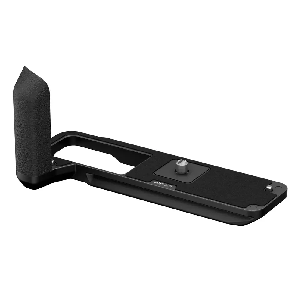 Der Handgriff MHG-XT5 ermöglicht bequemes und sicheres Fotografieren mit lichtstarken Objektiven oder langen Tele-Brennweiten. Der Handgriff wurde so gestaltet, dass sich Batterie und Speicherkarte bequem wechseln lassen, ohne ihn abnehmen zu müssen. Die Unterseite des Griffs dient als zugleich als Arca-Swiss-kompatible Schnellwechselplatte.