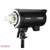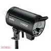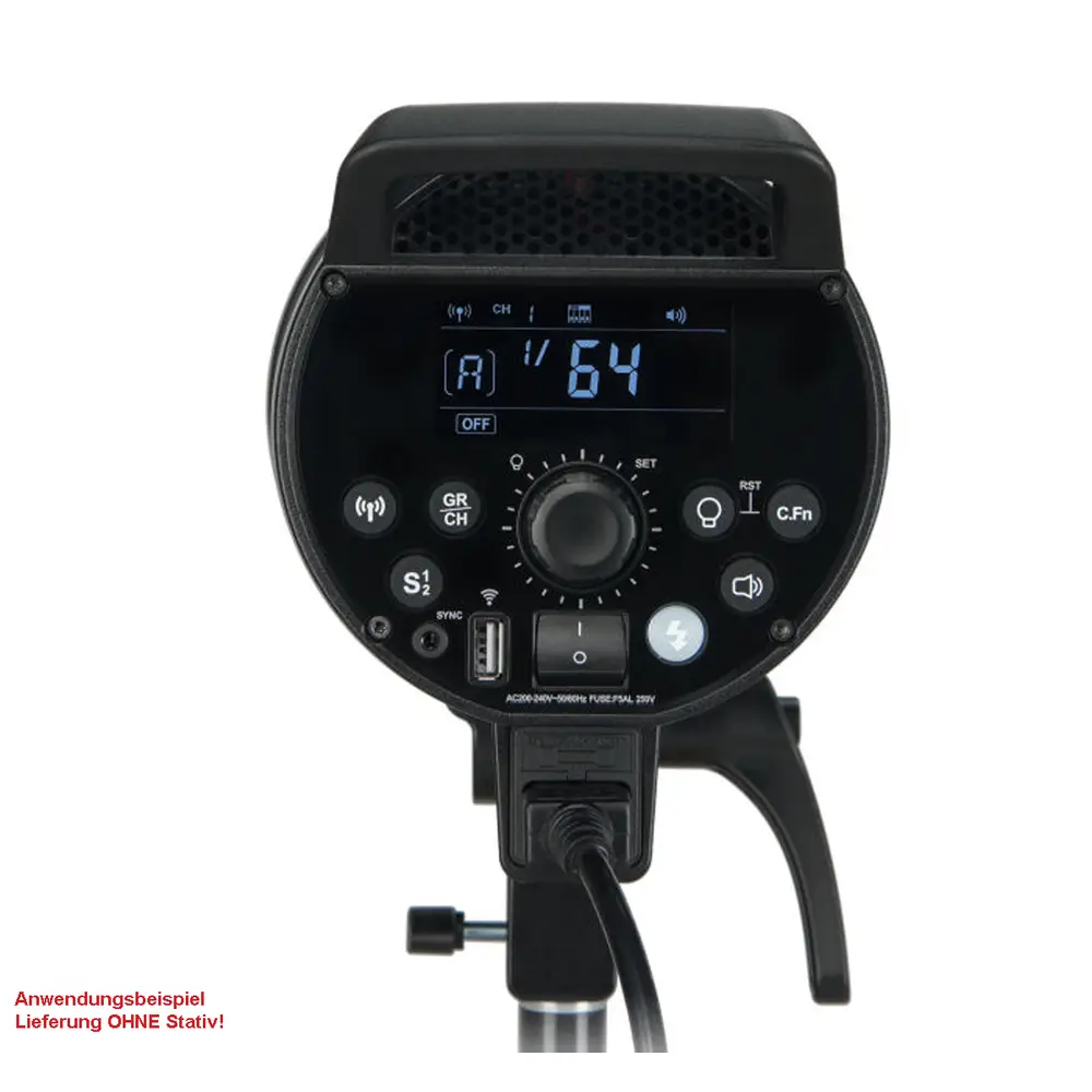 Auf der Vorderseite des Blitzgerätes befindet sich eine Bowens Zubehörhalterung. Dadurch können alle Godox Zubehörteile mit Godox Bajonett mit dem Blitzgerät verwendet werden. Unten am Blitzgerät befindet sich eine neigbare Stativhalterung. Im Lieferumfang des Studioblitzgerätes befinden sich eine Blitzröhre, eine Schutzabdeckung, eine Einstelllicht Lampe und ein 5 m Netzkabel.