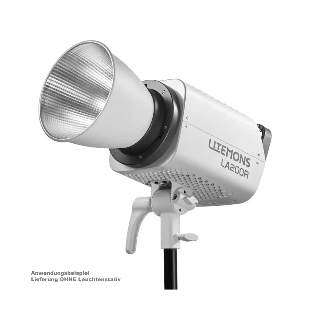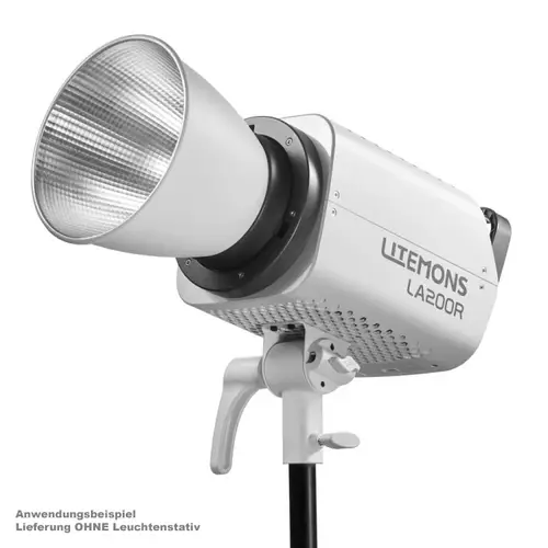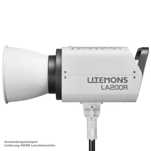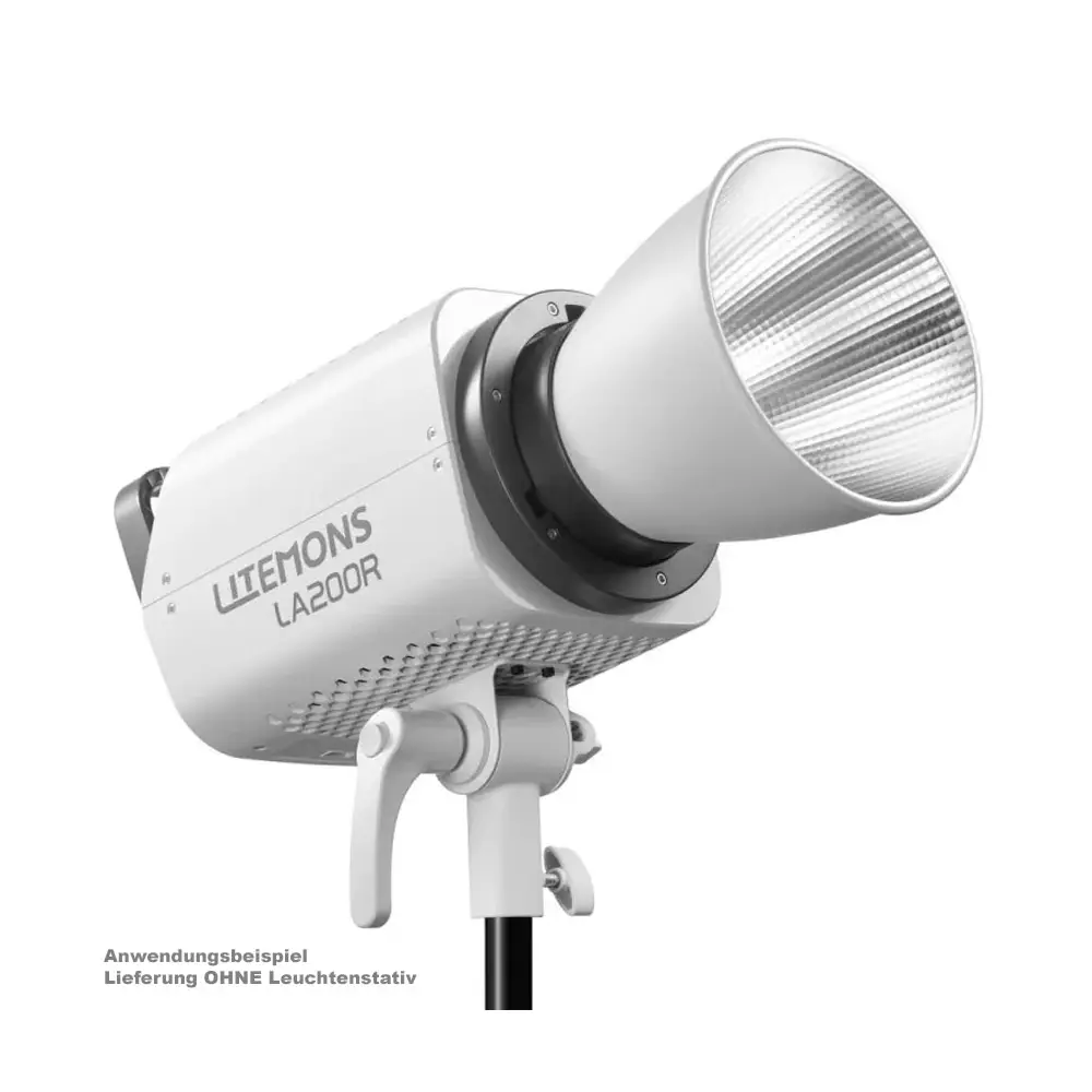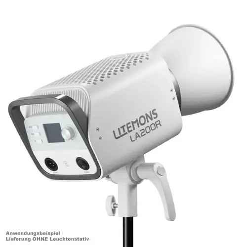 Das kompakte weiße Gehäuse enthält eine 220-Watt-Einheit, die leistungsstarkes Licht erzeugen kann. Die Leuchte verfügt über eine universelle Bowens-Halterung. Auf der Rückseite des Geräts befindet sich ein Bildschirm zur Überwachung der Parameter sowie Tasten und ein Drehregler für einfache Anpassungen. Die Litemons LA-Serie ist eine kompakte Beleuchtungslösung für alle Arten von Videoaufnahmen und Content-Erstellung.