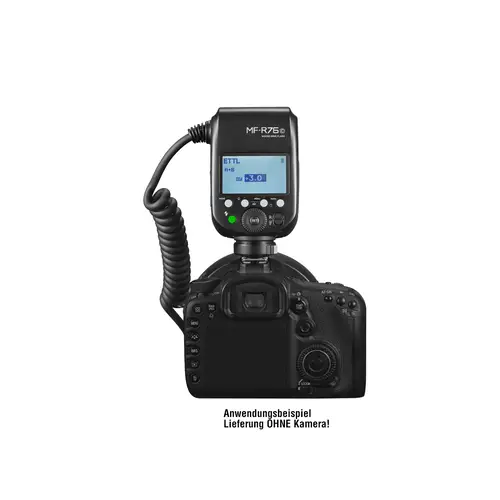 Das MF-R76 Makro Ringblitzgerät eignet sich perfekt für Nahaufnahmen. Die Positionierung des Ringblitzes direkt am Objektiv ermöglicht weiche und gleichmäßig ausgeleuchtete Aufnahmen aus extrem kurzer Entfernung. Die max. Leitzahl des Ringblitzgerätes bei ISO 100 beträgt 14. Der Controller des Blitzgerätes hat ein großen beleuchtetes LC-Display. Das Blitzgerät arbeitet in der Betriebsart Manuell.