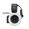 Der Ringblitz verfügt über 2 eingebaute Fokussierhilfen für Scharfstellen bei dunklem Licht sowie über A und B Blitzröhren, die unabhängig voneinander gesteuert werden können. Das Makro Ringblitzgerät hat einen herausnehmbaren 2600 mAh Lithium-Ionen Akku, mit dem bis zu 660 Blitze bei voller Leistung abgegeben werden können. Die Blitzbereitschaftszeit beträgt 1,5 Sekunden.