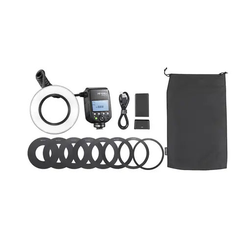 Im Lieferumfang des Ringblitzgerätes befinden sich 1x Lithium-Ionen Akku, 1x USB-Ladegerät, 1x USB-C Ladekabel, 8x Adapterringe in den Größen 49, 52, 55, 58, 62, 67, 72 und 77 mm und 1x Tragetasche.