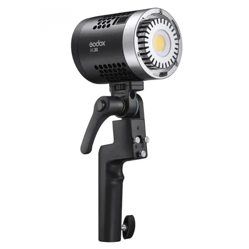 An der Vorderseite der Leuchte befindet sich eine Godox-Zubehörhalterung. Damit kann das gesamte Godox-Zubehör mit der Leuchte verwendet werden. Für Zubehör mit Bowens-Bajonett wird die S2-Halterung benötigt. Unten an der LED Leuchte befindet sich ein neigbarer, abnehmbaren Griff und eine Schirmhalterung. An diesem Griff wird der mitgelieferte Akku-Halter befestigt. Bei Verwendung von zwei optionalen NP-F970-Batterien ist ein Einsatz auch im Freien sehr gut möglich. Alternativ kann das Gerät mit dem mitgelieferten AC-Adapter (14.0V, 3.4A) über Netz betrieben werden.