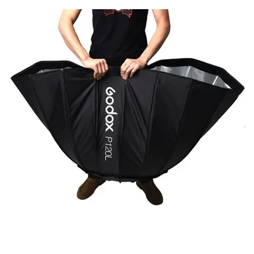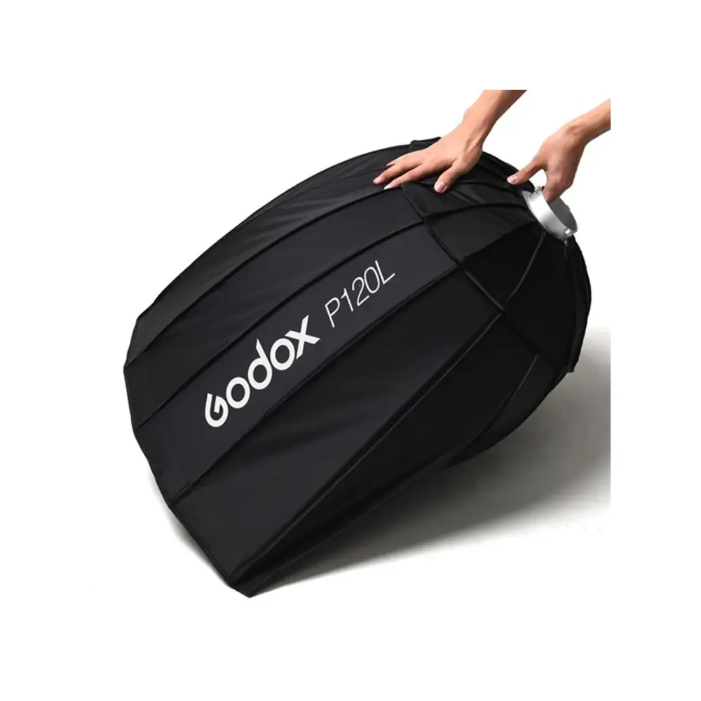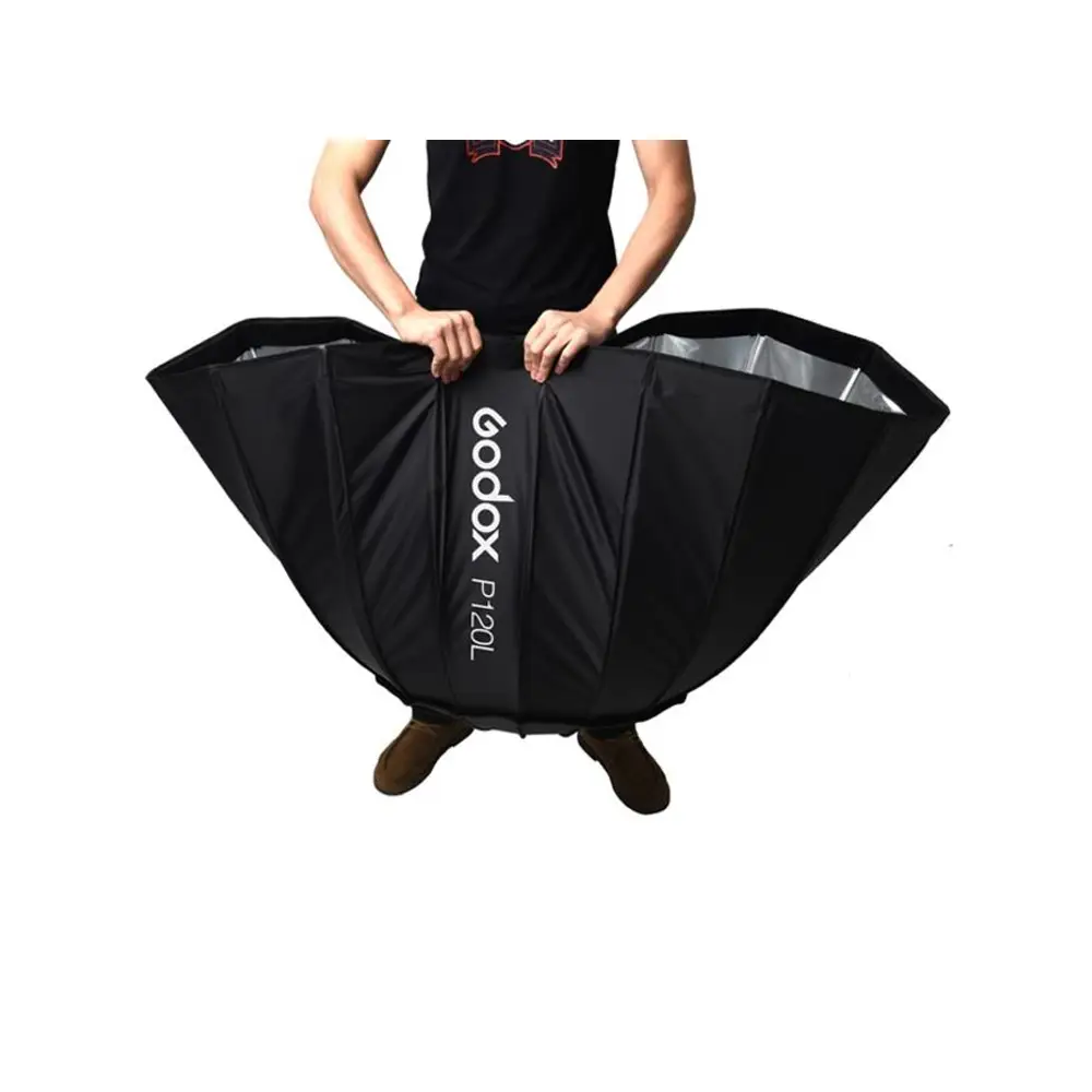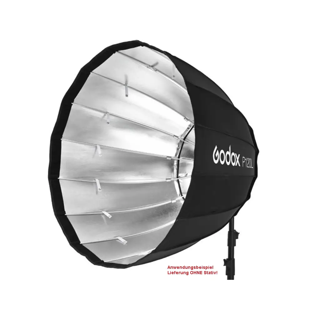 Der Durchmesser beträgt 120 cm. Diese Softbox ist eine Leichtgewicht-Version der P120 Softboxen. Die Softbox hat ein tiefes Design, welches eine diffuse Ausleuchtung und eine progressiv abnehmende Helligkeit von der Mitte zu den Rändern hin ermöglicht. Sie erzeugt eine weiche und gleichmäßige Ausleuchtung.