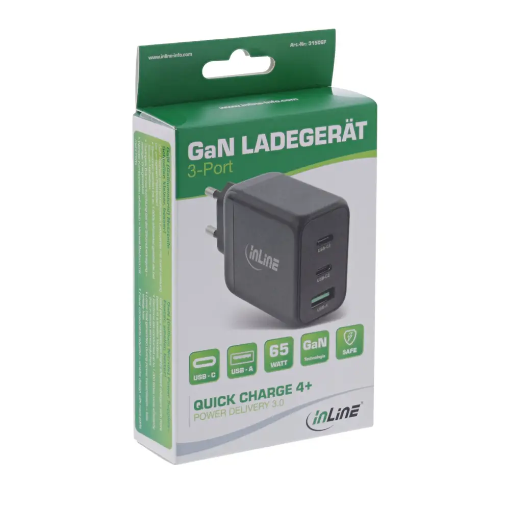 Erleben Sie das leistungsstarke und kompakte 65W GaN-Ladegerät mit 2x USB-C Anschluss und 1x USB-A Anschluss - die perfekte Lösung für schnelles und effizientes Laden mehrerer Geräte gleichzeitig! Dank der GaN (Galliumnitrid) Technologie ist dieses Netzteil hocheffizient und ermöglicht eine bessere Leistung bei gleichzeitig kleinerer Bauform. Die Elektronen werden bis zu 1.000x effizienter geleitet als bei herkömmlichen Silizium-Halbleitern, was zu einer geringeren Wärmeentwicklung und weniger Energieverlust führt. Das 65W GaN-Ladegerät unterstützt außerdem Power Delivery 3.0 und Quickcharge 4+ und bietet verschiedene Ausgangsoptionen.