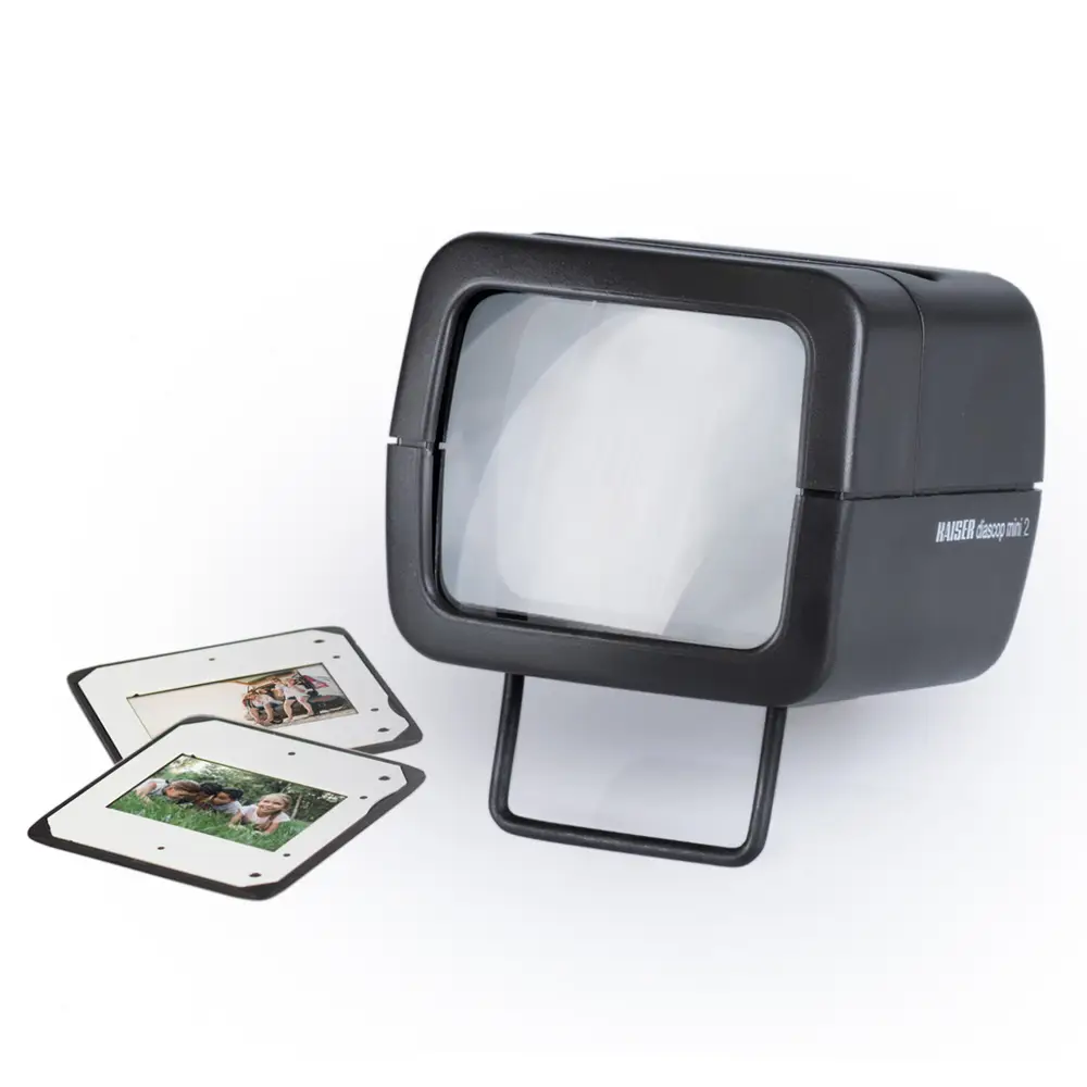 Kleiner kompakter Dia-Betrachter mit Licht für gerahmte Dias 5 x 5 cm. Mit 2-fach vergrößernder Doppellinse.Lampe: 2,5 V, 0,3 A, E 10, KugelformLinse: 63 x 53 mmMaße (BxHxT): ca. 75 x 60 x 105 mm