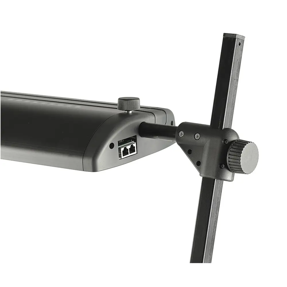 Leuchtengehäuse aus stabilem, eloxiertem Aluminium-Profil, schwenk-, verschieb- und höhenverstellbar. Abnehmbare Softscheiben. Vertikale Haltestangen mit Höhenmarkierungen, schwenkbar in Rastgelenken. Befestigung mit stabilen Druckguss-Klemmsockeln. Spannweite bis 48 mm. Inklusive Netzteil.