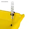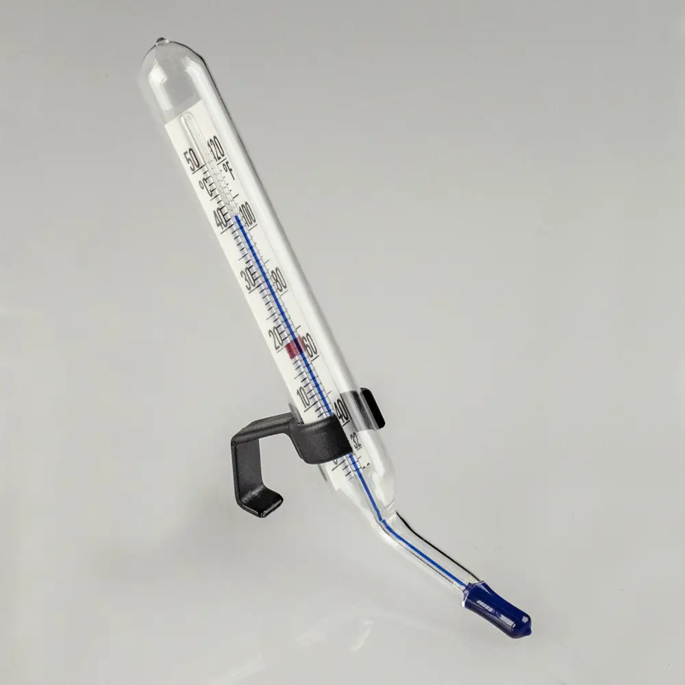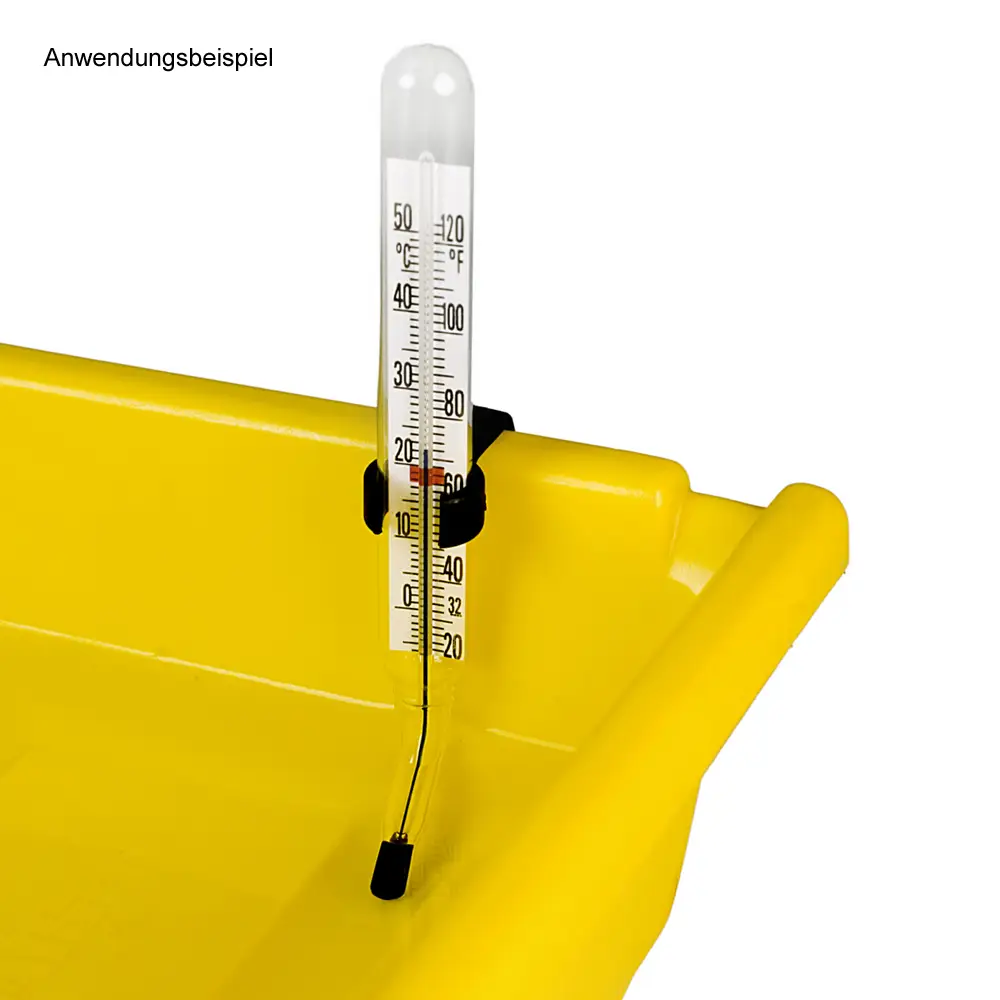 Abgewinkelte Ausführung mit Bügel zum Einhängen am Schalenrand. Alkoholfüllung. Celsius- und Fahrenheit-Skala 0 ... 50° C bzw. 32 ... 120° F. Markierung bei 18° C (64° F). Länge: 85 mm + 40 mm Schenkellänge, ø 10 mm