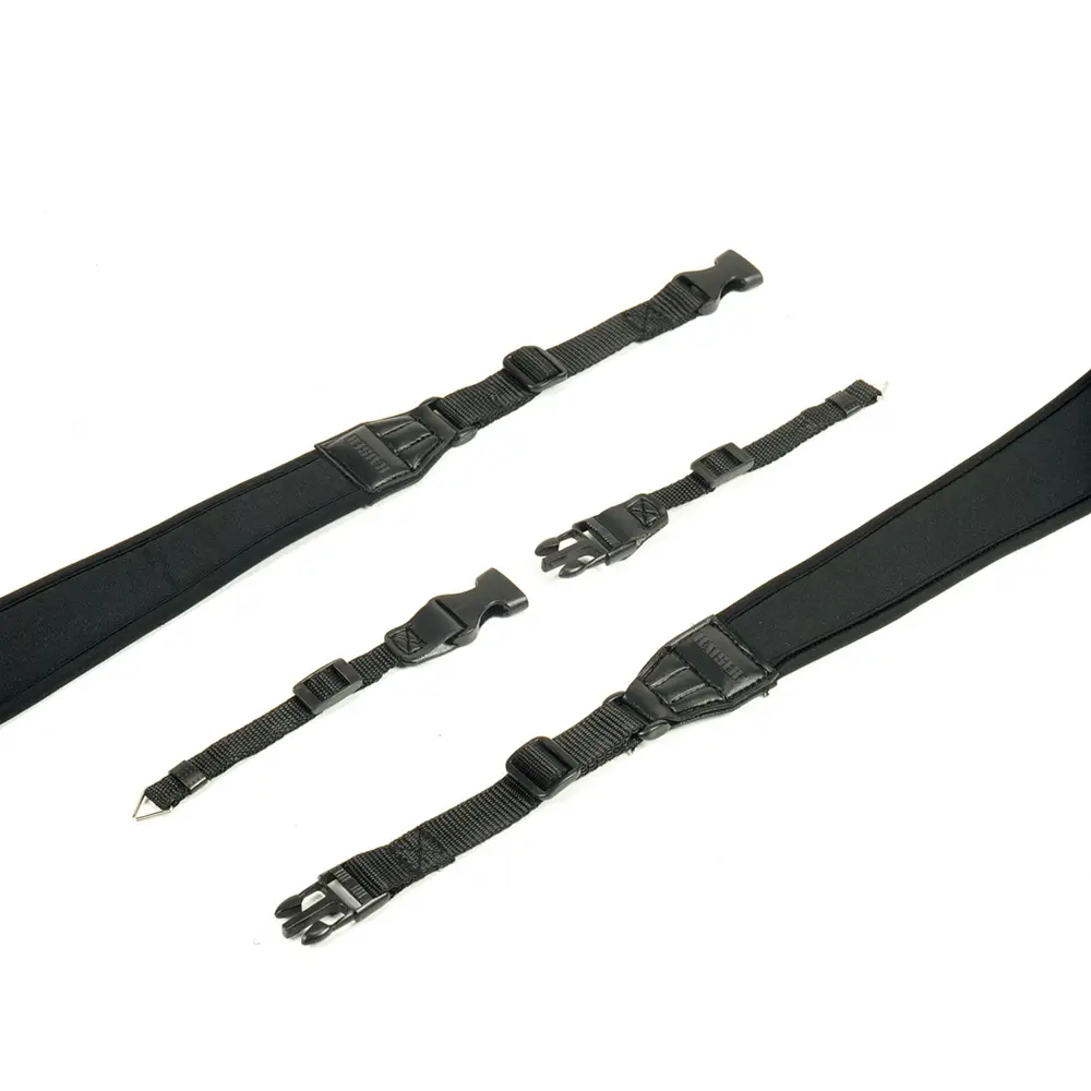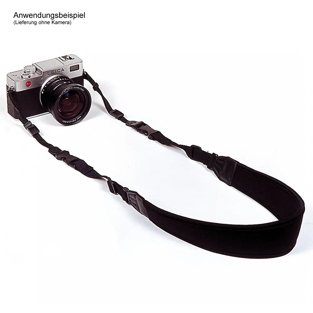 Schulterauflage aus elastischem, hochwertigem Neopren, Ränder mit Gewebe kaschiert. Hoher Tragekomfort. Bogenförmig geschnitten, passt sich ergonomisch der Schulter bzw. dem Nacken an. Haltbar und strapazierfähig. Länge verstellbar. Die Enden des Gurtes lassen sich vom Neoprenteil abnehmen und können zu einer Handschlaufe verbunden werden.