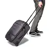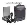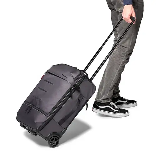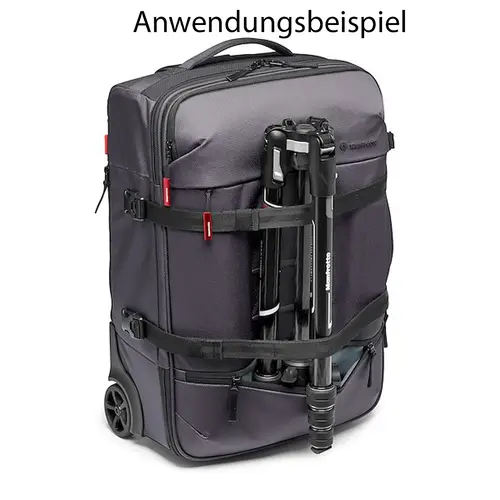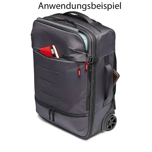 Die beiden Räder der Tasche erleichtern den Transport schwerer Ausrüstung, eine Fronttasche ermöglicht schnellen Zugriff auf einen 15-Zoll-Laptop oder Zubehör und für die Fotoausrüstung gibt es einen zweiten Zugang von oben.