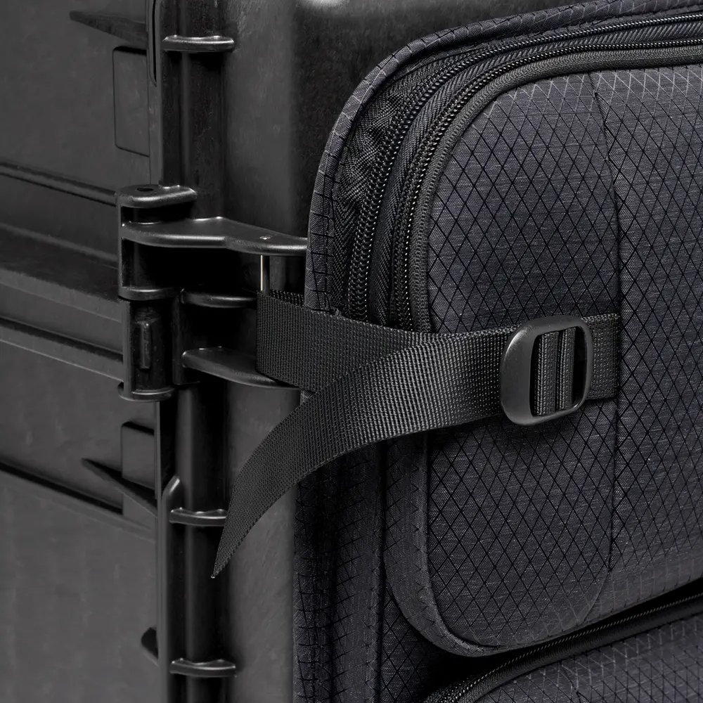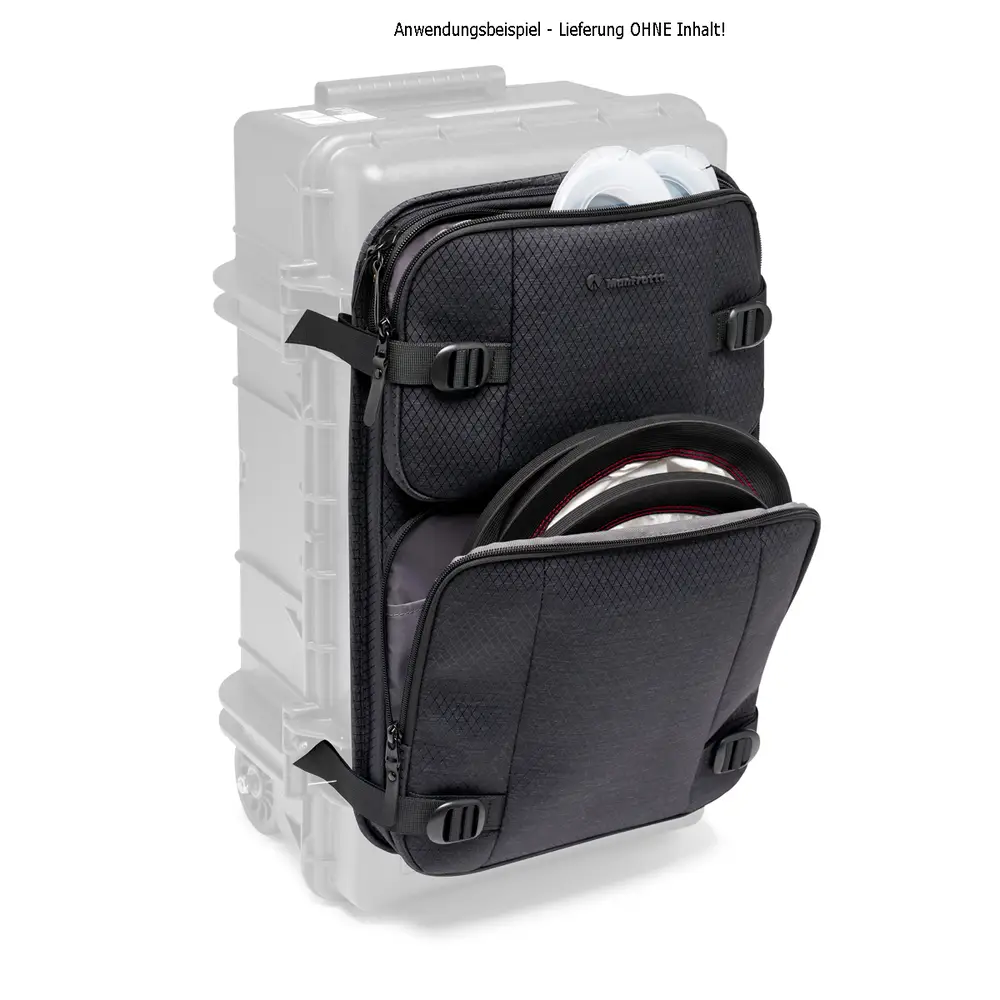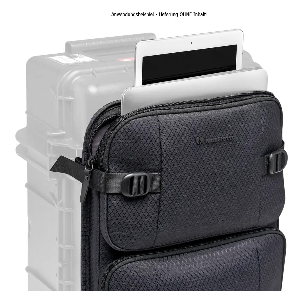 Durch 4 oder 6 (je nach Modell des Hartschalenkoffers) bequem platzierte Metallstifte an der Vorderseite des Manfrotto Hartschalenkoffers kann diese Tough Laptop Tasche durch ein robustes und langlebiges, verstellbares Riemensystem leicht verbunden werden, um die Tragbarkeit der Ausrüstung mit einem praktischen Laptopfach zu verbessern.Diese Laptoptasche bietet Platz für Laptops bis zu 15'''' in einem speziellen gepolsterten Fach. An der Vorderseite befinden sich zwei tiefe Taschen zur Aufbewahrung von diversem Zubehör, Ladegeräten und kleiner Elektronik. Darüber hinaus kann diese Laptoptasche auch als eigenständige Tragelösung für Ihren Laptop verwendet werden. Der mitgelieferte Schultergurt lässt sich einfach befestigen, so dass Sie die Tasche über der Schulter tragen können.Die PRO Light Tough Laptoptasche besteht aus behandeltem Material, das feuchtigkeits- und wasserabweisend ist. Hauptmerkmale• Exklusive Transportlösung für Manfrotto Tough Hartschalenkoffer• Modulares Design, kompatibel mit allen Manfrotto Tough Cases• Transportiert und schützt bis zu einem 15'''' Laptop• Zwei Fronttaschen zum Verstauen von Zubehör und Elektronik• Dank mitgeliefertem Schultergurt als Laptoptasche verwendbarSpezifikationen Farbe SchwarzMaterial Nylon; SynthetikfaserLeergewicht 0,77 kgPlatz für Persönliches JaStativhalterung NeinTaschenart TragelösungWasserabweisend JaVolumen 2LAußenmaß (LxBxH) 29 x 7 x 46 cmInnenmaß (LxBxH) 27 x 2,5 x 43 cmLaptop bis Größe (LxBxH) 27 x 2,5 x 43 cm