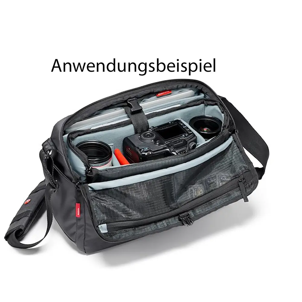 Dank des inneren, herausnehmbaren Einsatzes mit Logo-Aufdruck, kann in dem Speedy-30 Messenger eine mittelgroße DSLR mit aufgesetztem Standart-Zoomobjektiv und drei zusätzliche Objektiven verstaut werden. Diese Tasche ist mit dem äußerst funktionalen, neuen „Flexy Camera Shell“ ausgestattet, einem innovativen Schutzsystem, das speziell von Manfrotto konzipiert wurde. Das smarte, klettbare Trennwandsystem schützt das Equipment effektiv und lässt sich mühelos an unterschiedlichste Foto-Equipment- Konstellationen und Body- oder Objektivgrößen anpassen. Mit den roten, flexiblen Trennstücken können Sie die Tasche ganz individuell Ihren Bedürfnissen anpassen.