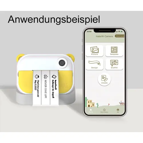 Fotos drahtlos übertragen werden, und es gibt eine spezielle mobile Anwendung für die Bearbeitung/Erstellung von Etiketten, und schließlich wird eine Halterung mitgeliefert, in der Sie Ihr kleines süßes Gerät abstellen können!